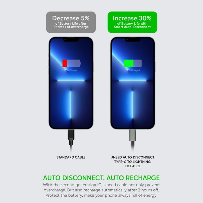 Promo UNEED Kabel Data Auto Disconnect Type C to iPhone Lightning - UCB45Ci Handphone Led - Type C to Lightning Elegan