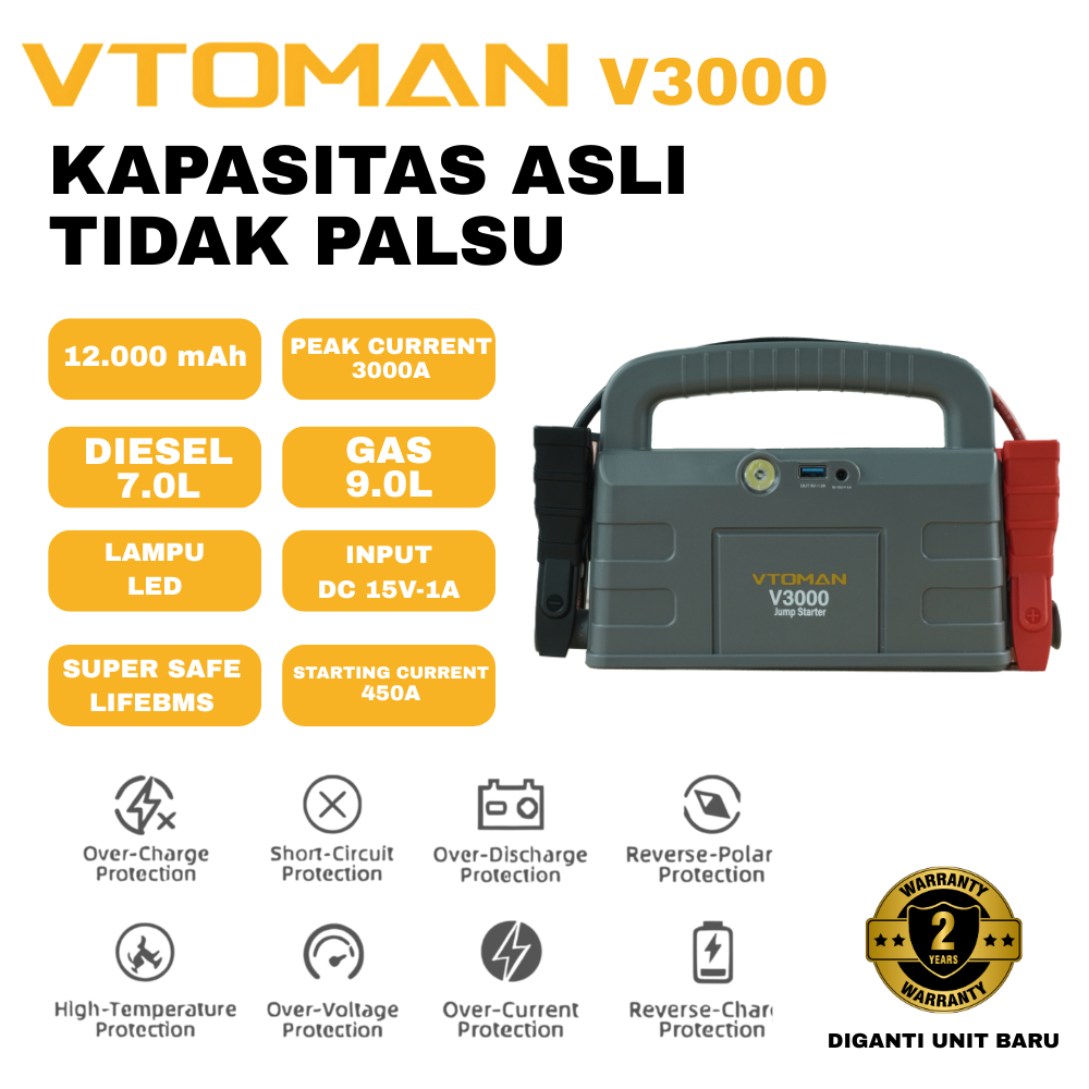 VTOMAN V3000 Jumper Aki 12000mAh 12V Powerbank Jumper Aki Mobil Dan Motor Car Jump Starter Multifungsi Power Bank Mobil