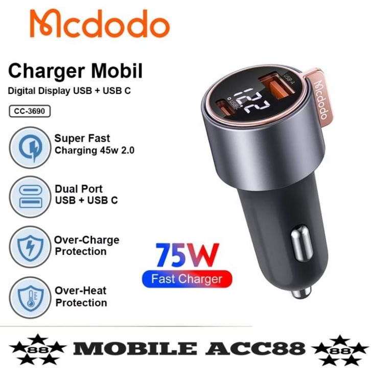 Mcdodo Car Charger Mobil USB A+ Type C PD QC 3.0 Fast Charging 75w CC-3690