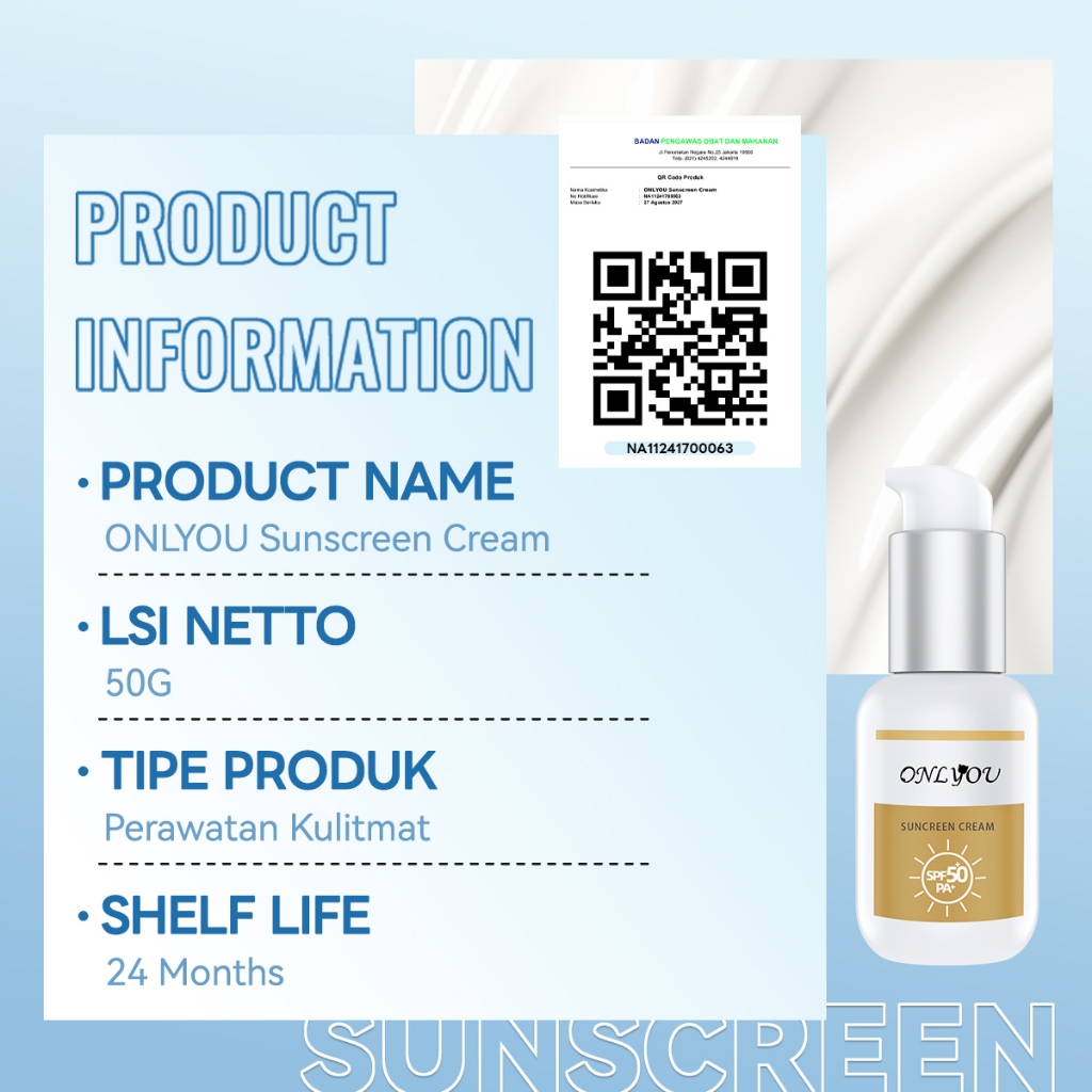 【BPOM】ONLYOU Sunscreen Cream SPF 50+ PA+ Sunscreen Face & Body Menyegarkan Tahan Air dan Tahan Keringat Whitening Sunblock