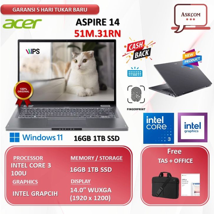 Laptop Acer Aspire 14 Core 3 100U 16GB 1TB SSD W11+OHS 14.0WUXGA IPS 51M.31RN