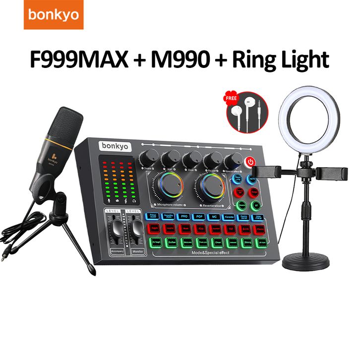 sound card Bonkyo 【Set Streaming Lengkap】sound card F999MAX + Mikrofon M990 + Lampu Penguat Cahaya - Ideal untuk Live St