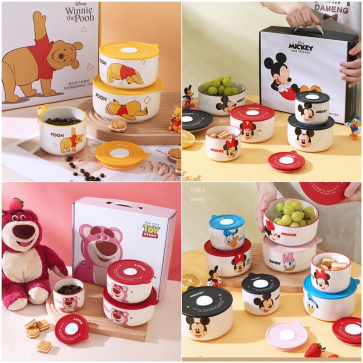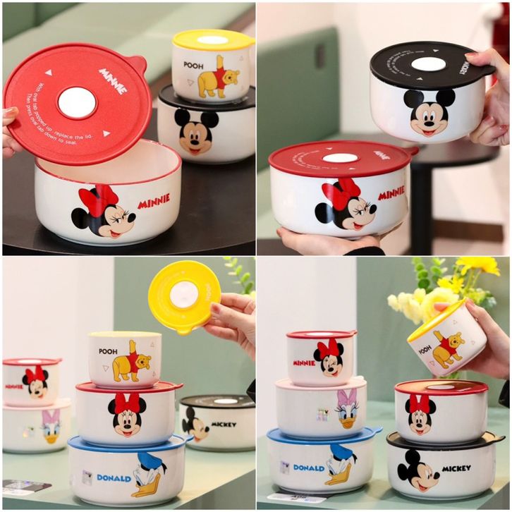 Grosir dis ney ceramic container set bowl mangkok keramik premium dengan tutup Keren