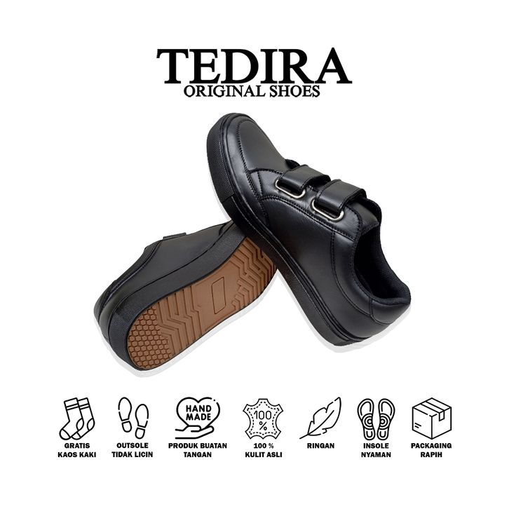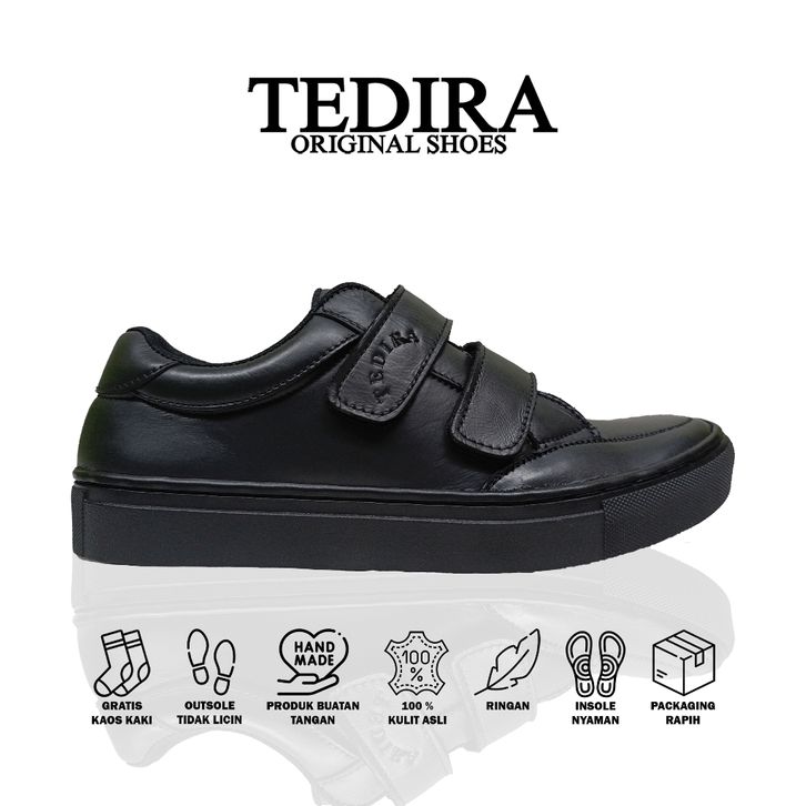 Promo TEDIRA Orinal Sepatu Sneakers Velcro Kulit Asli Hitam Full Black TDR05 New