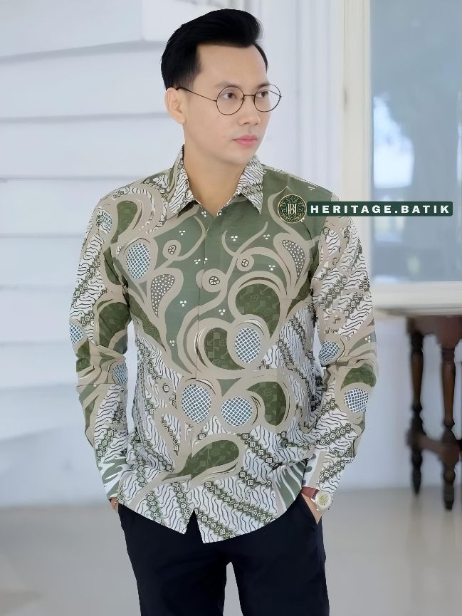 Warna SAGE GREEN TERBARU Kemeja Batik Pria Lengan Panjang slim-fitt MOTIF GAMBIRAN SAGE Baju Batik pria Lengan Panjang