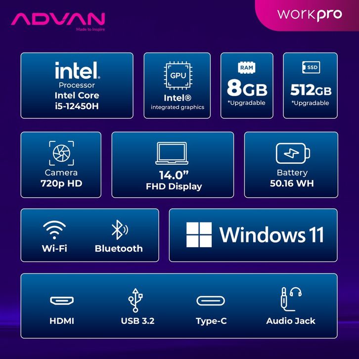 Murah Advan WorkPro Laptop intel Core i5-12450H ram 8GB/16GB ssd 512GB 14" IPS Windows 11 Elegan