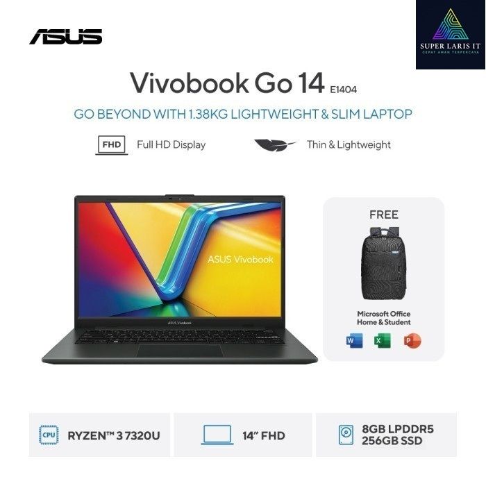 Grosir ASUS book Go 14 E1404FA-FHD321M FHD322M FHD323M AMD Ryzen 3 R3 7320U ram 8GB ssd 256GB 14" FHD W11 OHS Keren