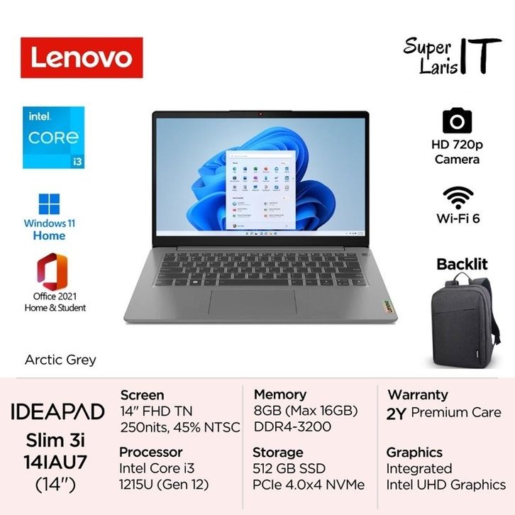 Terlaris Lenovo IdeaPad 3 14IAU7 FNID intel core i3-1215U ram 8GB ssd 512GB 14" FHD Windows 11 OHS Keren
