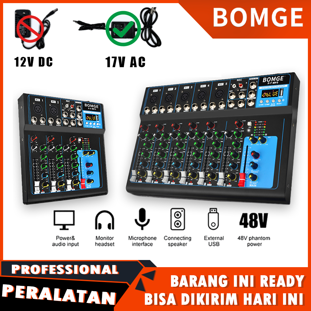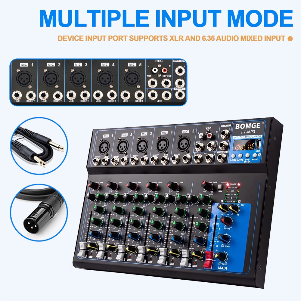 BOMGE F7 Bluetooth Portable Audio Mixer w/USB DJ Sound Mixing Console MP3 Jack 48V Power for Computer Recording, 7-Chann