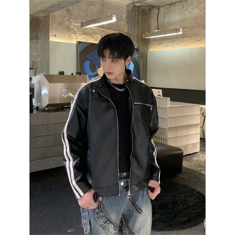 JAKET KULIT PRIA TERBARU STYLE KOREA READY HITAM DAN COKLAT STRIP PUTIH