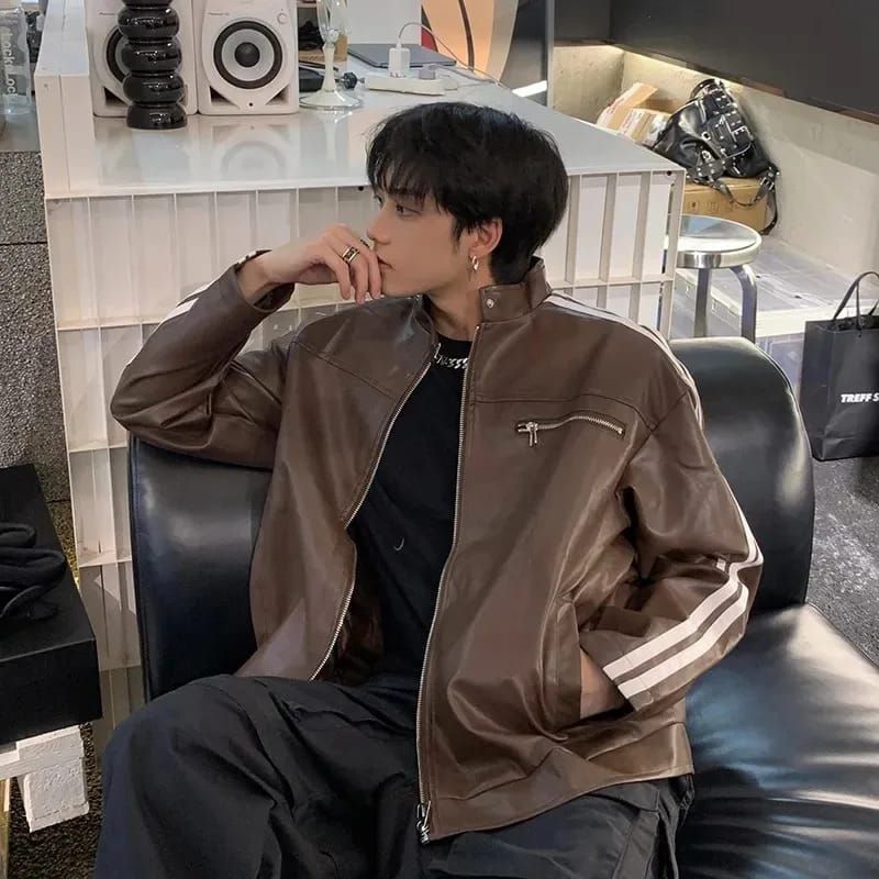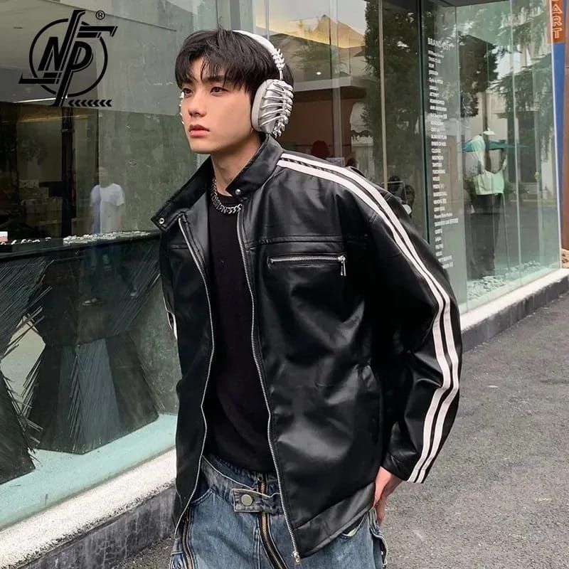 LEATHER JAKET MOTORCYCLE JAKET KULIT PRIA DAN WANITA STRIP OVERSIZE