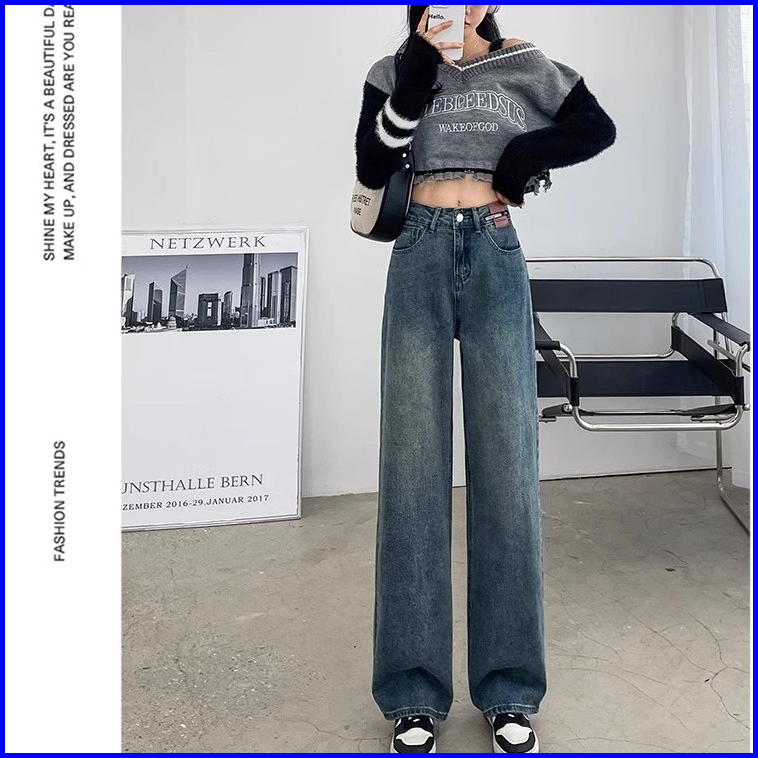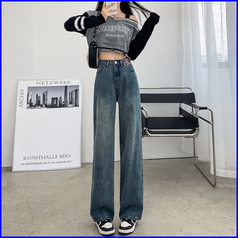 Keygirl Jumbo Highwaist Loose Jeans Kulot Biru Retro Korea Style Straight Pants Premium Kekinian