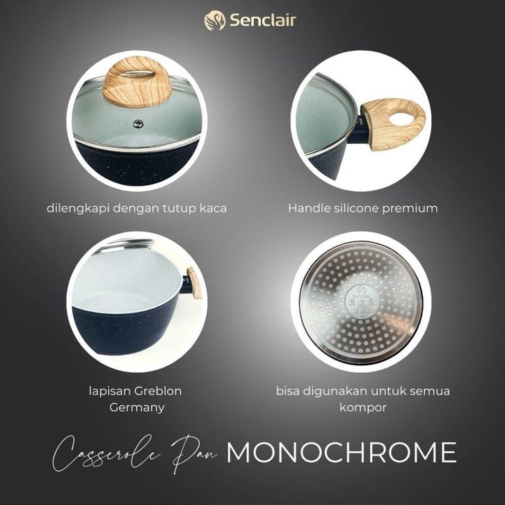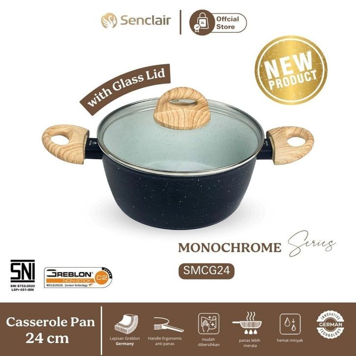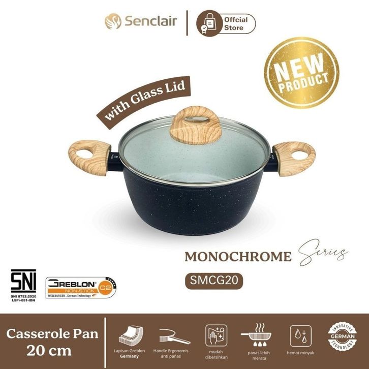 Senclair Monochrome Casserole Dengan Tutup Kaca Panci Cookware Peralatan Masak Anti Lengket SMCG