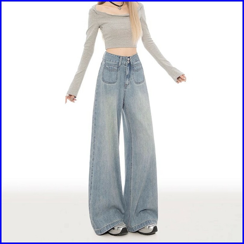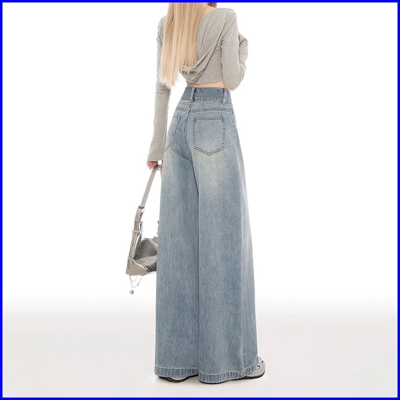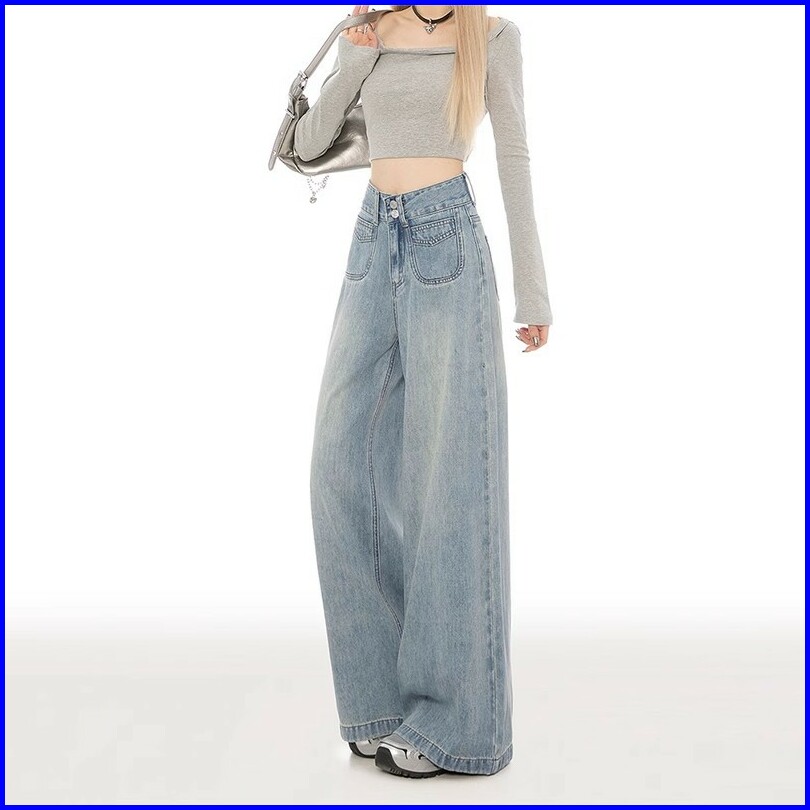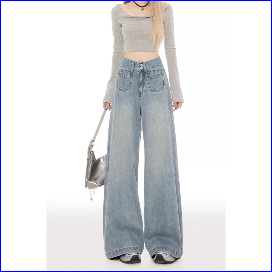Keygirl Celana Jeans Berkobar Pinggang Tinggi Baggy Jins Wanita Longgar Lurus Celana Denim Kaki Lebar Lurus Kasual Jumbo