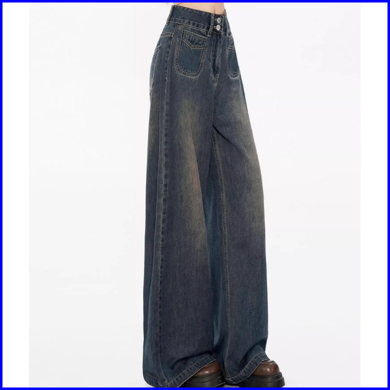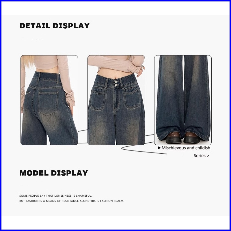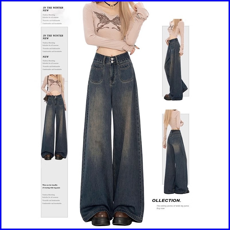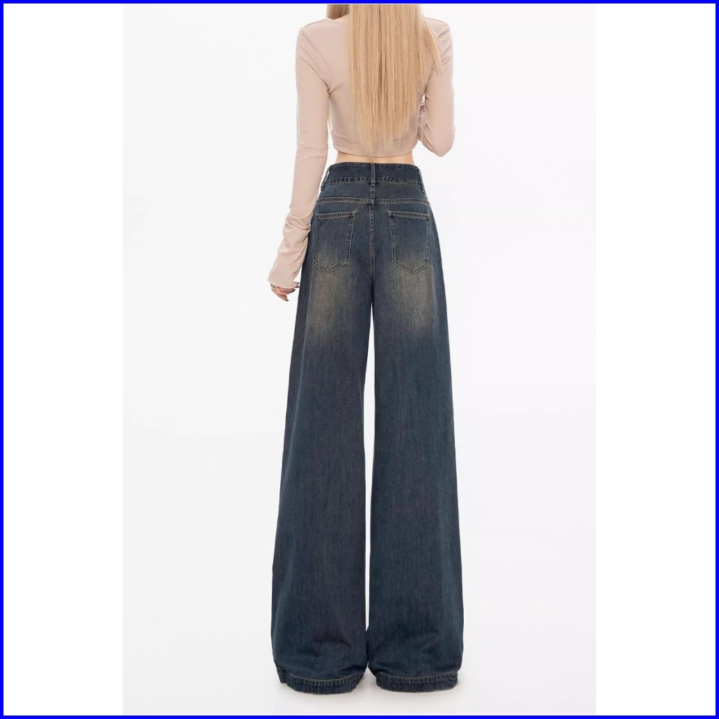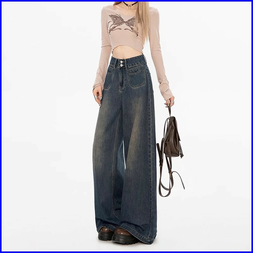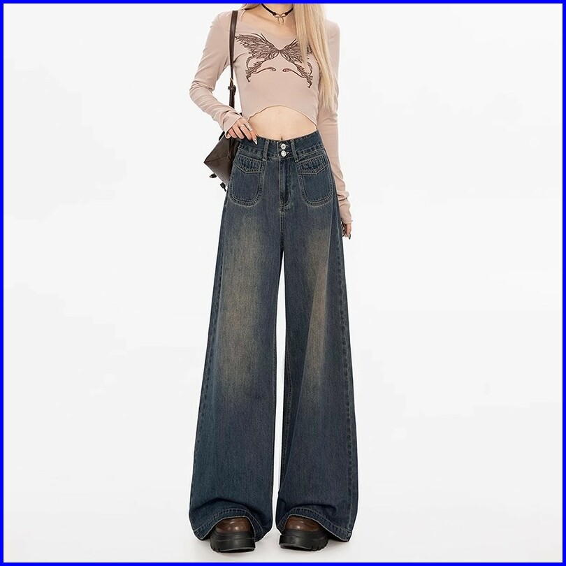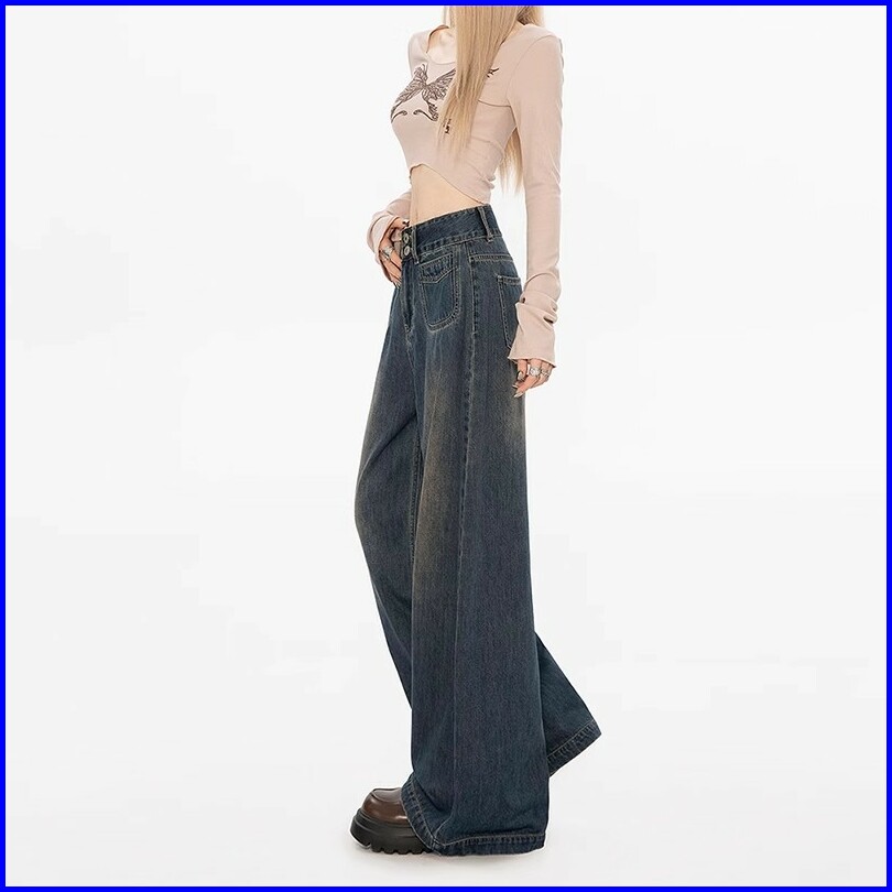 Keygirl Celana Jeans Biru Retro Panjang Celana Jeans Longgar Lurus Pinggang Tinggi Denim Kaki Lebar Kasual Retro Korea