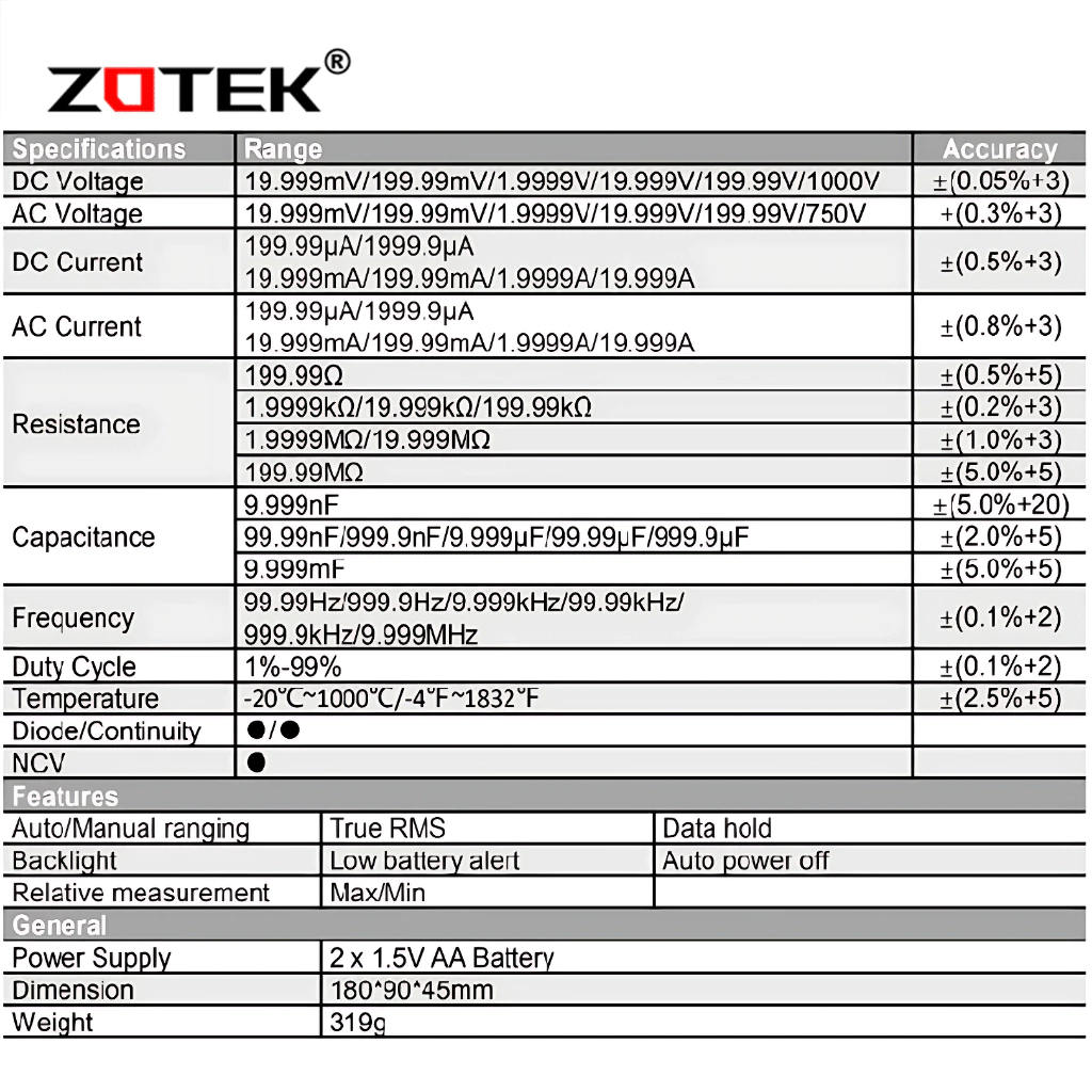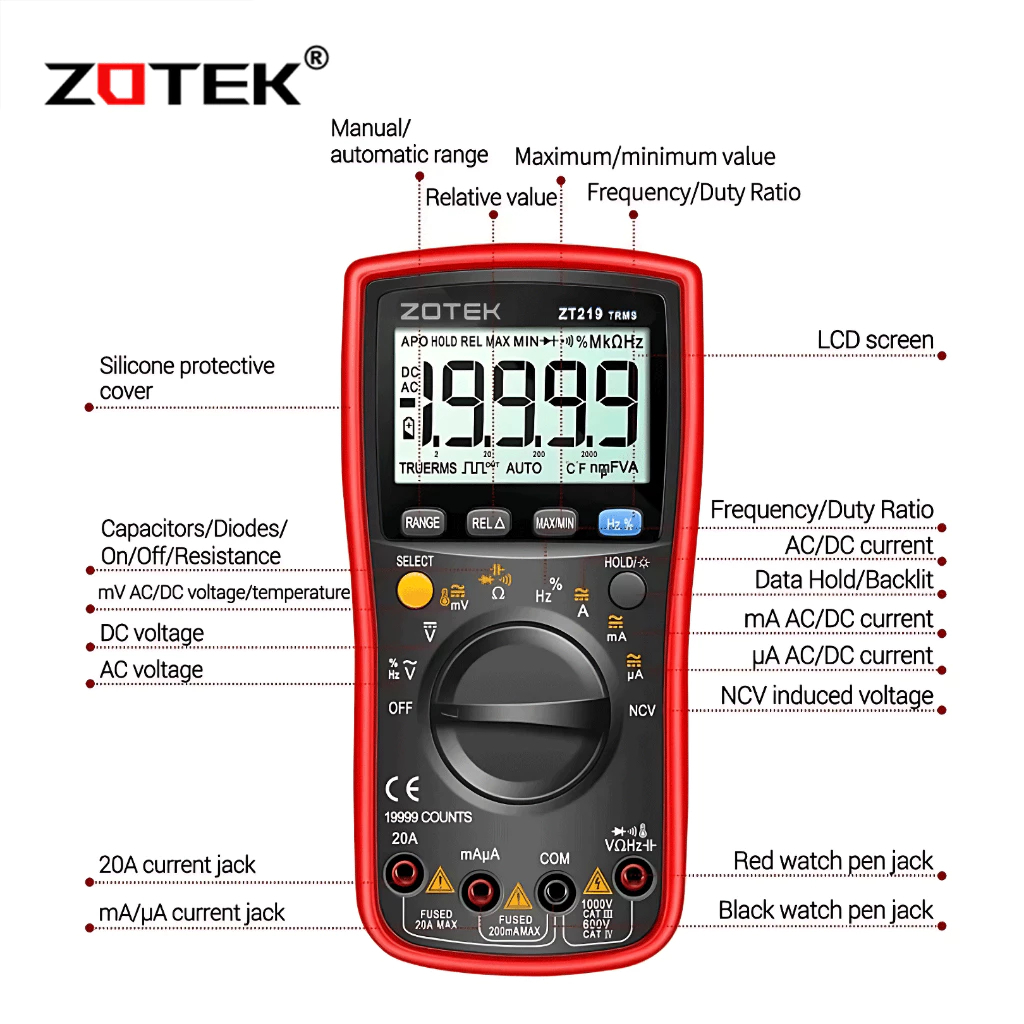 Zotek ZT219 19999 Counts True-RMS Auto Range AC/DC Diode Meter ZT-219 Original