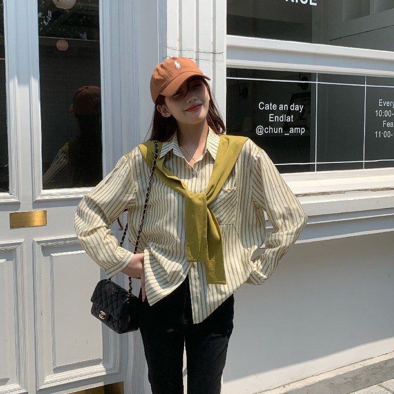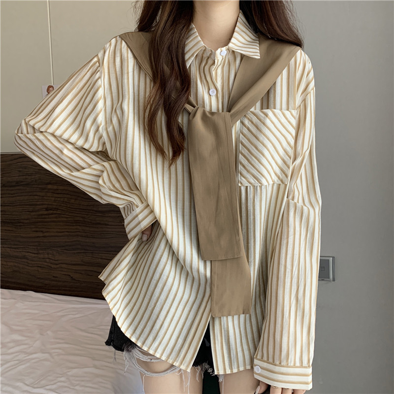 KEMEJA WANITA LENGAN PANJANG MODEL KOREA DESAIN FASHIONABLE DENGAN KERAH SELENDANG DAN MOTIF GARIS LONGGAR DAN STYLISH
