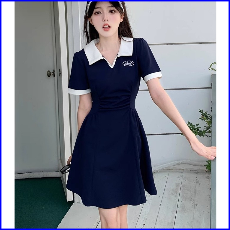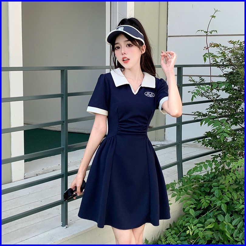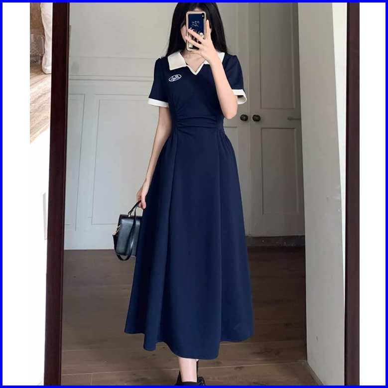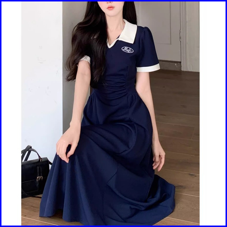 Keygirl Maxi Dress Gaun Panjang Leher Polo Korea Dress Wanita Short Sleeved A-line Skirt