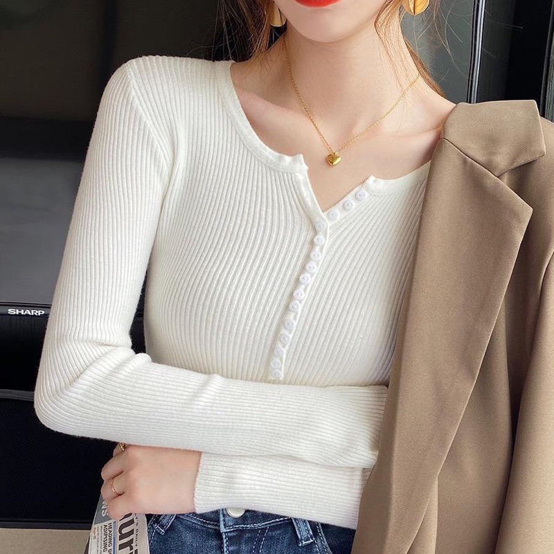 ATASAN V-NECK RAJUT LENGAN PANJANG WANITA KAOS VNECK MOTIF KANCING