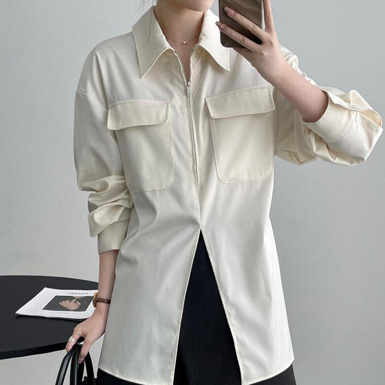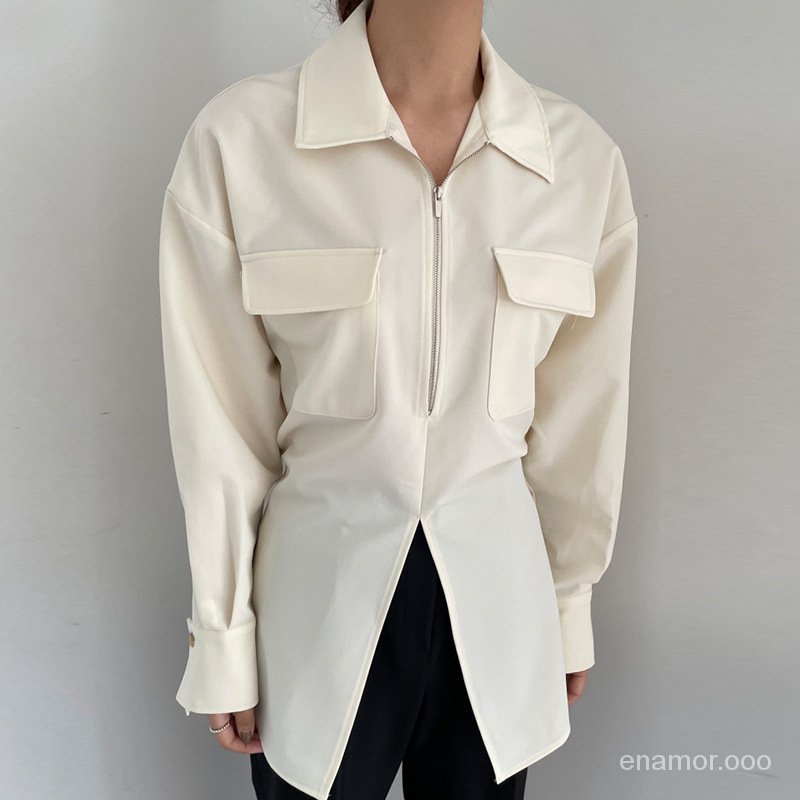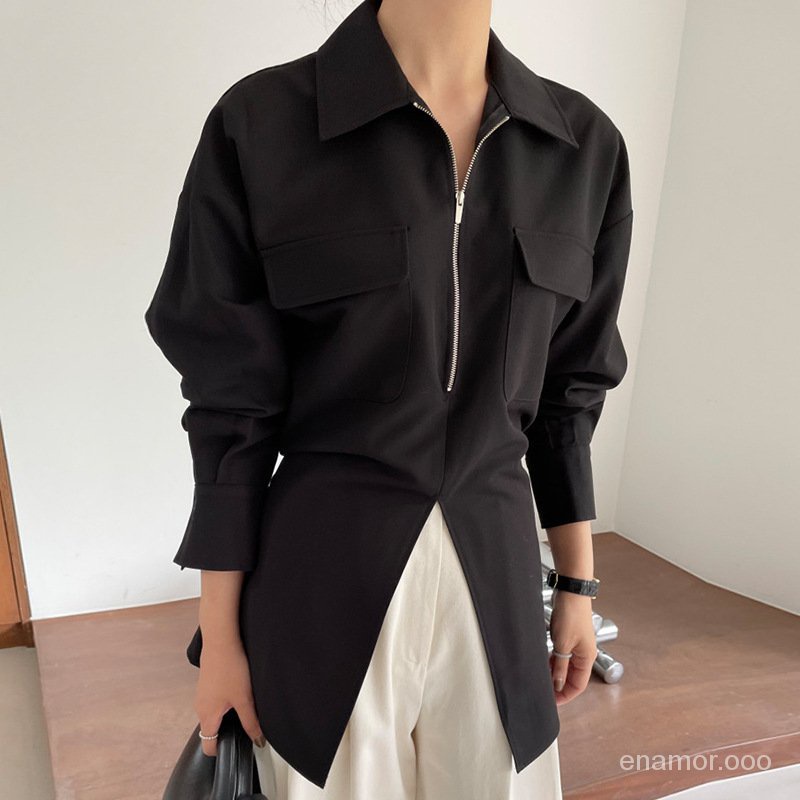 [READY][ENAMOR] DESAIN RITSLETING KERAH TEMPERAMEN MINIMALIST SAKU GANDA KEMBALI RENDA CELAH KEMEJA WANITA