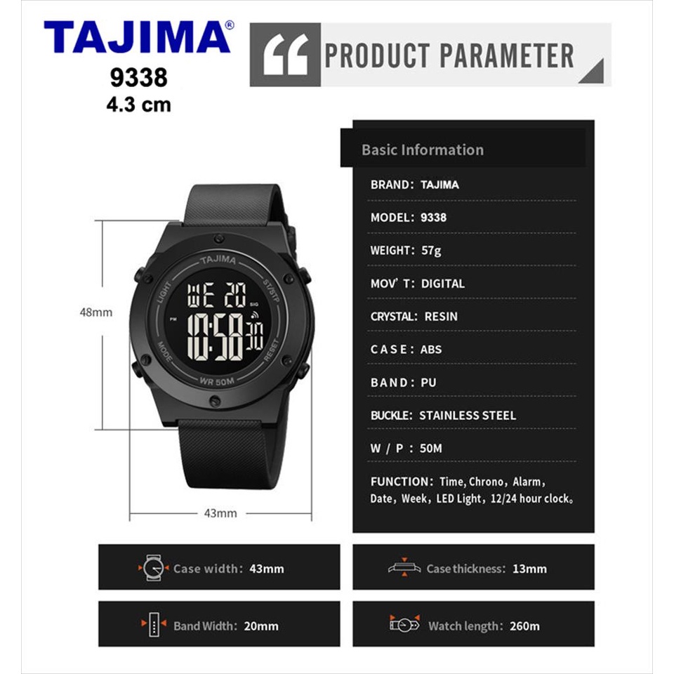 TAJIMA Jam Tangan Digital Pria 9338 LED Light Water Resist Original Garansi 1 Tahun + Free BOX