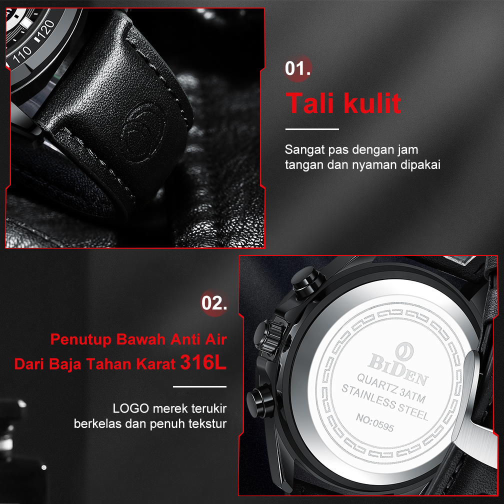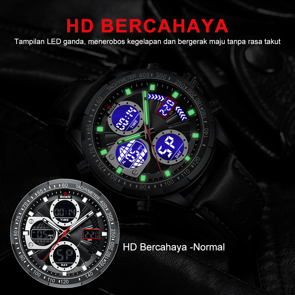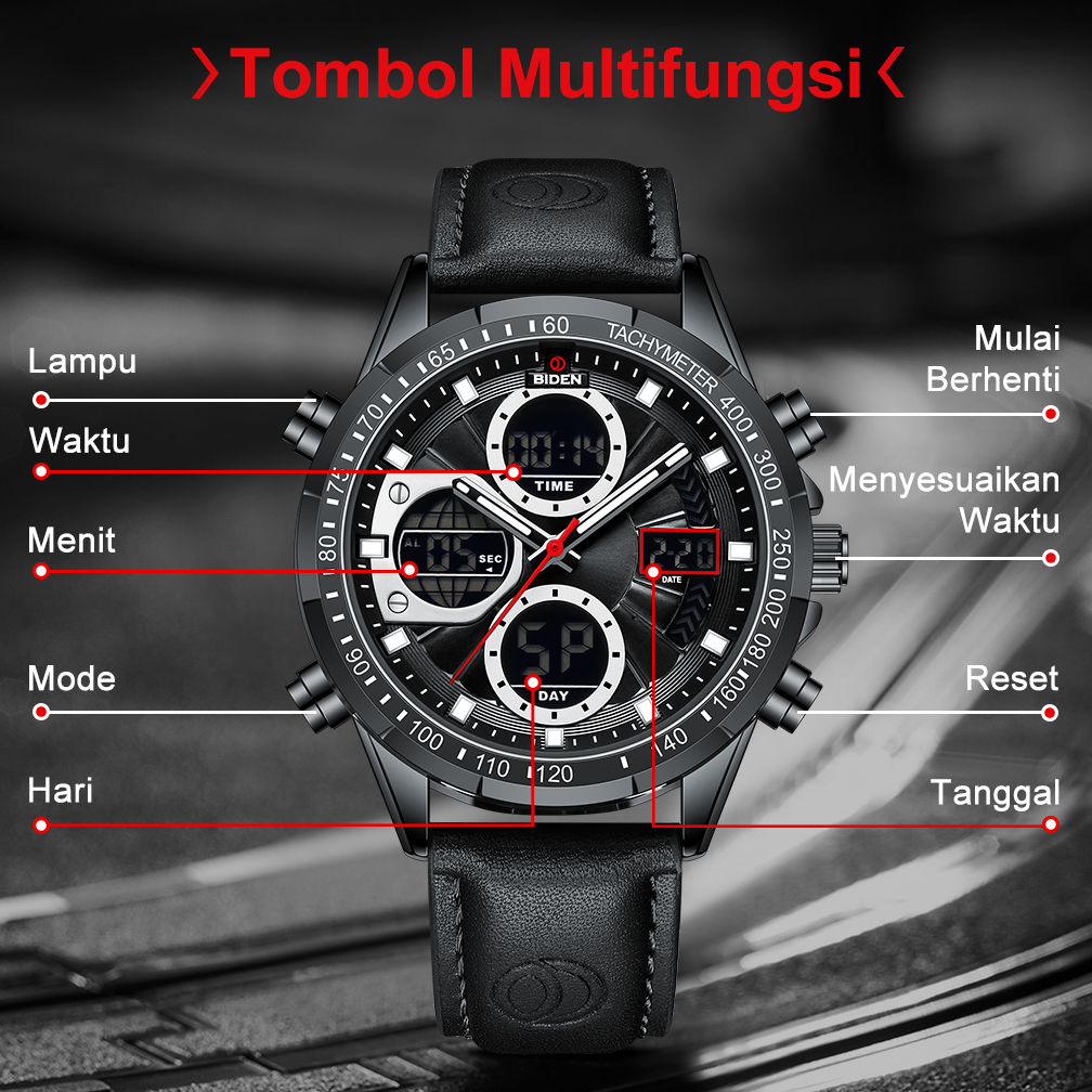 BIDEN Jam Tangan Pria Anti Air Original Olahraga Multifungsi Alarm Kalender Bercahaya Tali Kulit Jam Tangan Cowok