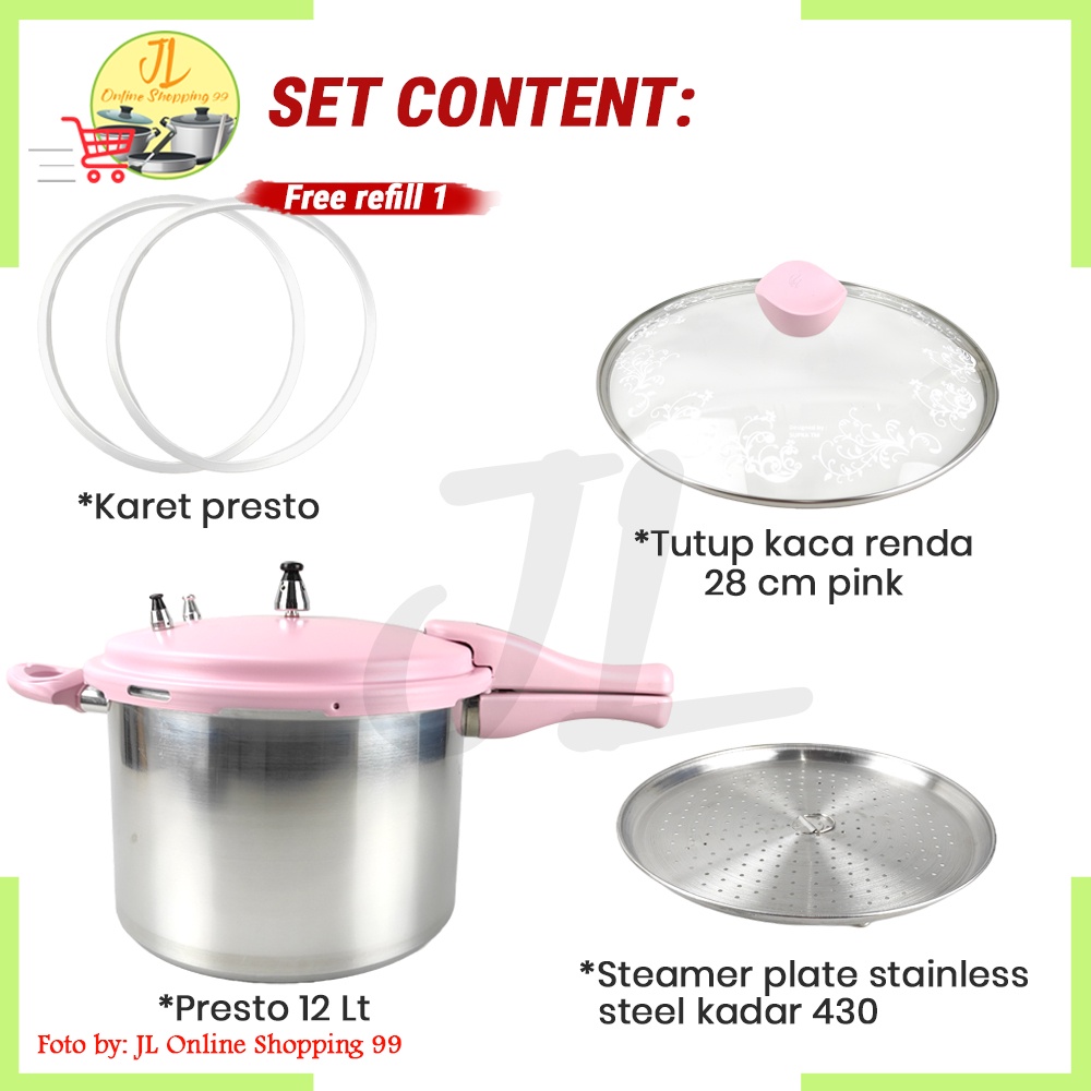 New SUPRA Panci presto 12liter + steamer + tutup kaca pastel Pink / pressure cooker alumunium / pengempuk kukusan