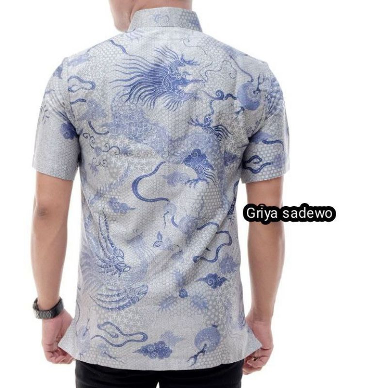 Kemeja Baju Batik Pria Dewasa Lengan Pendek Tulis Kombinasi Motif Naga Abu