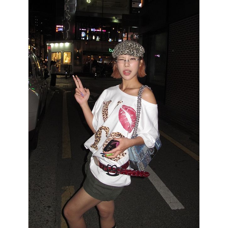Kaos Wanita Lengan Pendek Love Leopard Atasan Wanita Model One Shoulder Korean Style TERBARU