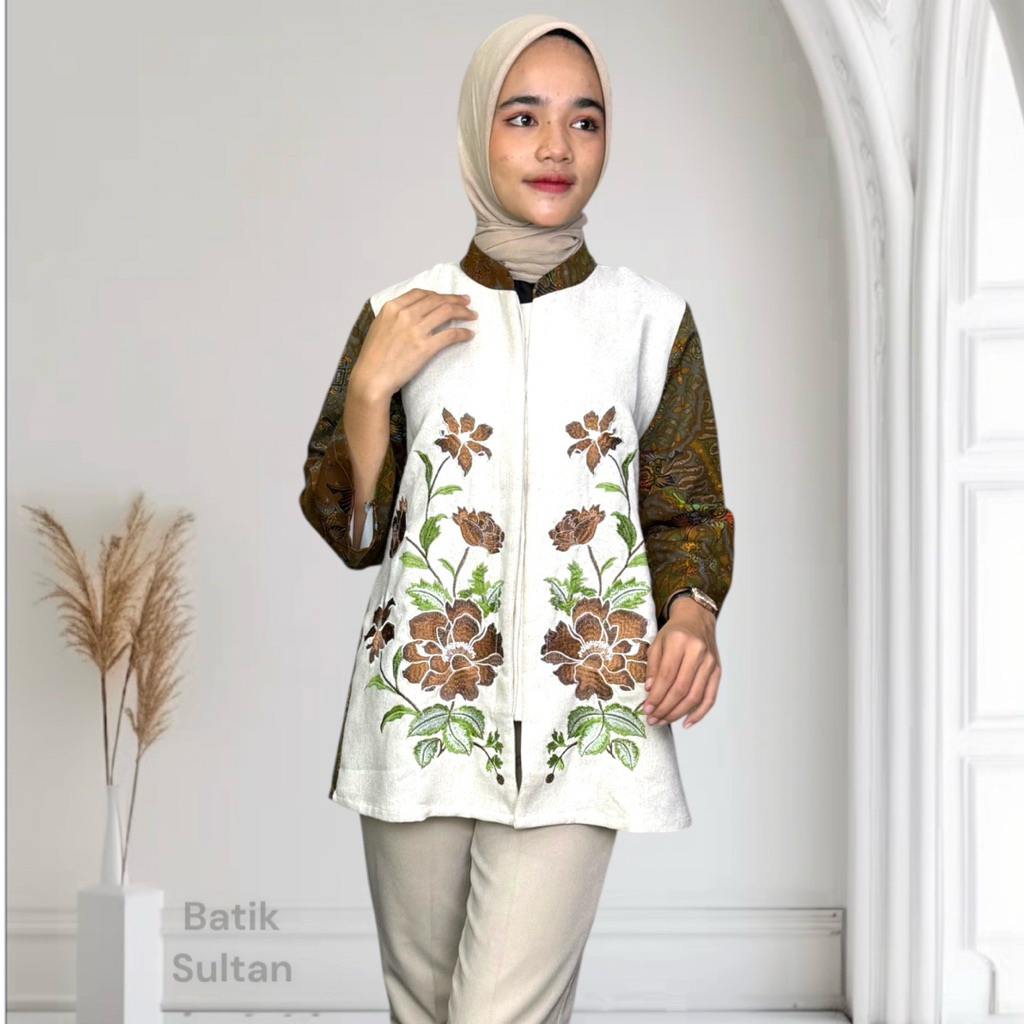 ATASAN BLOUSE BATIK WANITA KAIN KATUN HAND PRINT LAPISAN FURING TRICOT WAFFLE KERJA FORMAL PESTA WHITE YELLOW