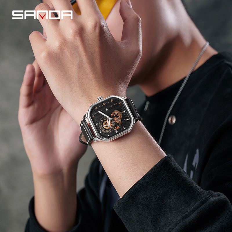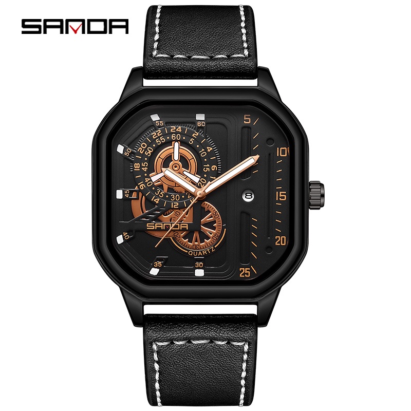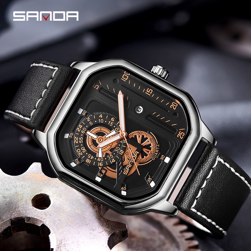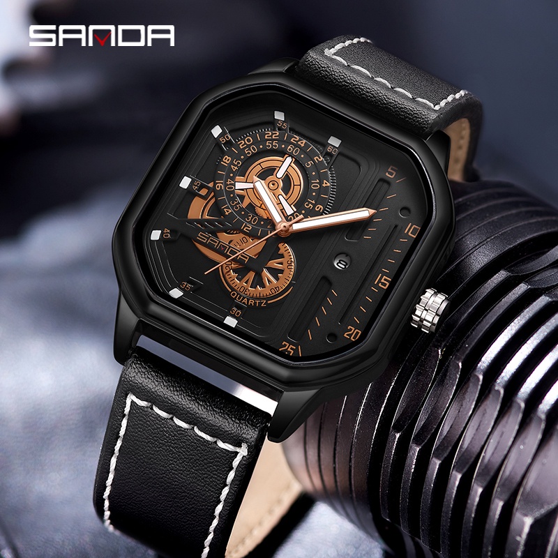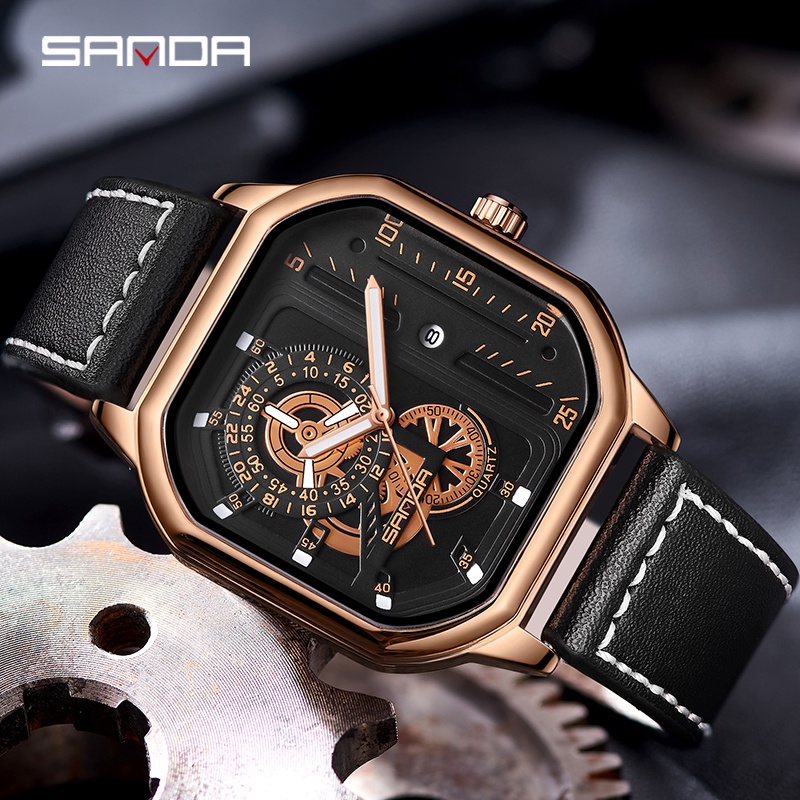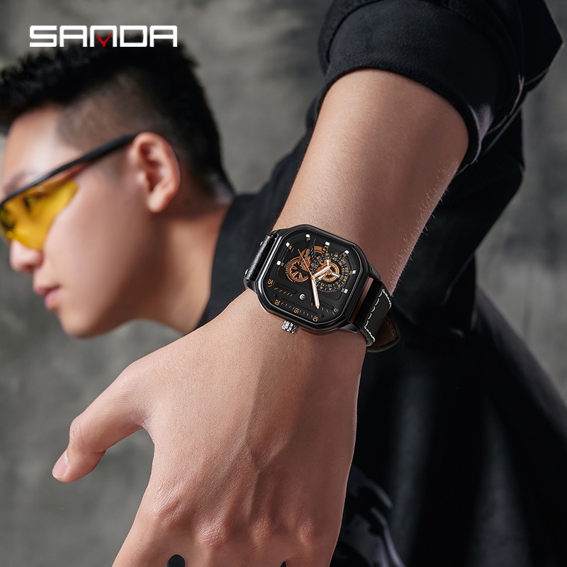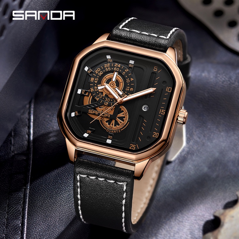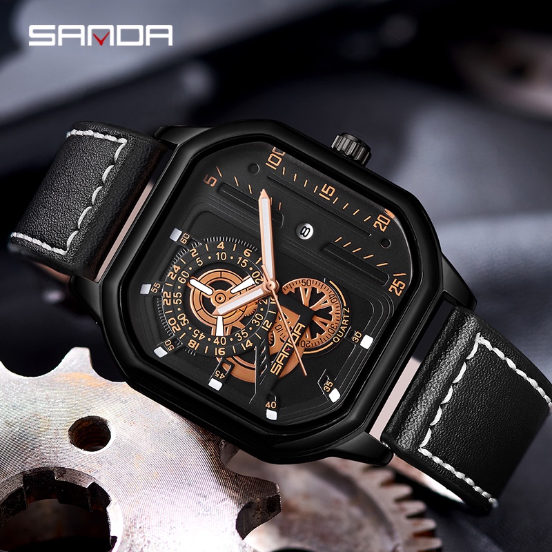 SANDA 7038 Jam Tangan Pria Analog Chronograph Tali Kulit Luminous Display