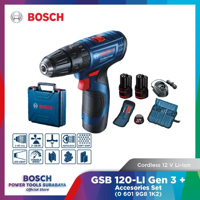 Mesin Bor Tembok 10mm Bosch GSB 120-LI Gen 3 & Accesories Set