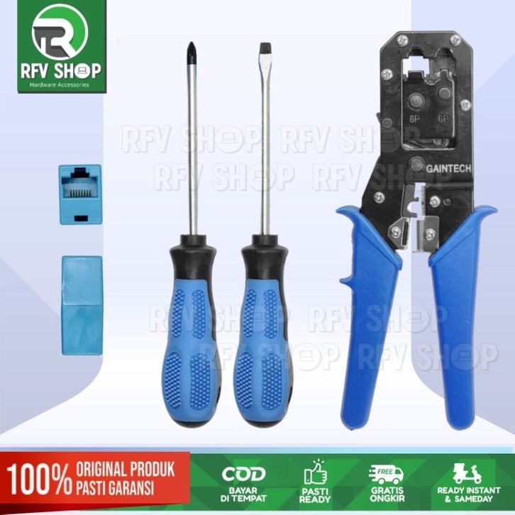 PAKET TOOLKIT 7 IN 1 NETWORK CABLE REPAIR TOOL KIT SET GT-580 Crimping Tool, Lan Tester, Stripper Tool , Pouch