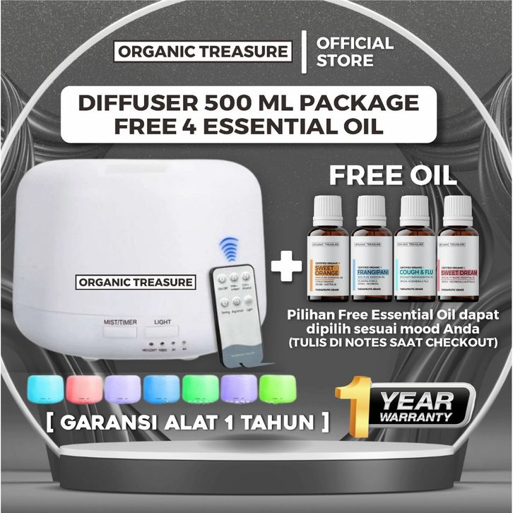 Paket Diffuser 500ML Aromatherapy FREE 4 Essential Oil Grade+ [ 1 YEAR GUARANTEE ]
