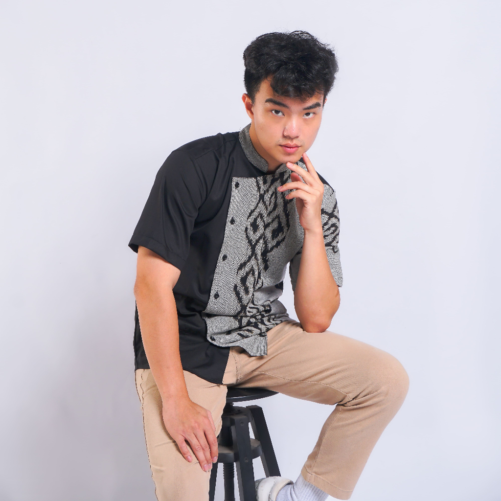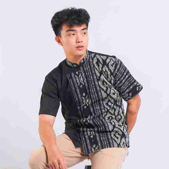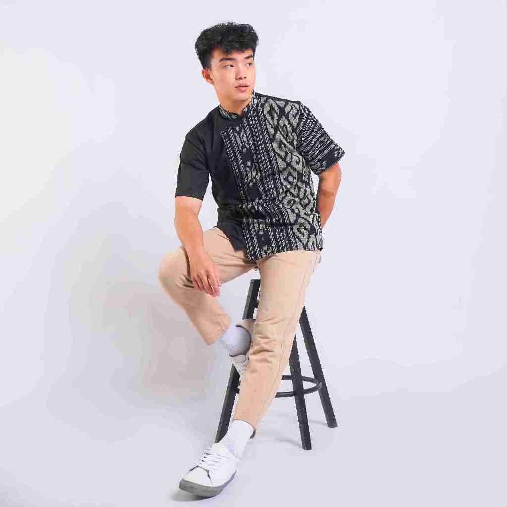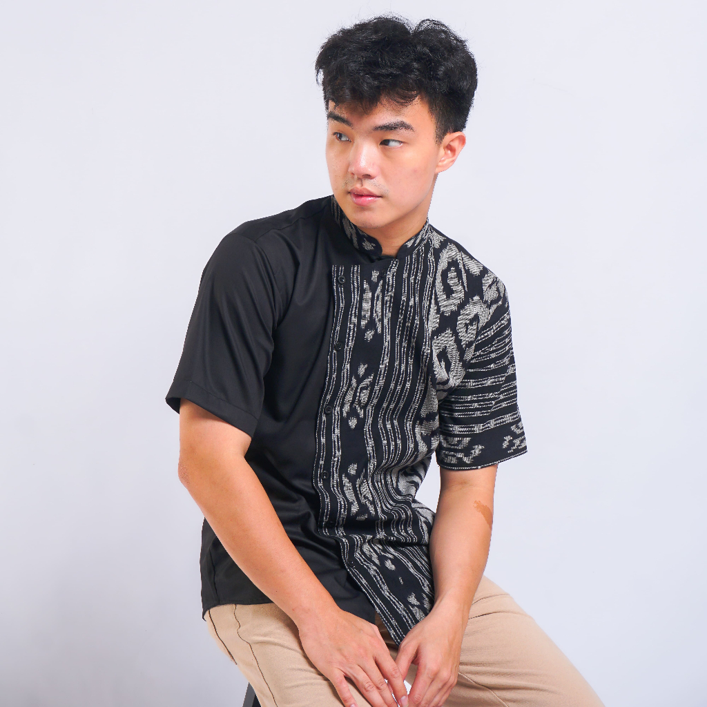 BOENOE - KEMEJA ABIMANTRA LENGAN PENDEK PRIA KERAH SHANGHAI TENUN IKAT SONGKET ASLI KOMBINASI POLOS KATUN TOYOBO - MUSLIM ETNIK BAJU KOKO MANDARIN COLLAR LEBARAN RAMADHAN