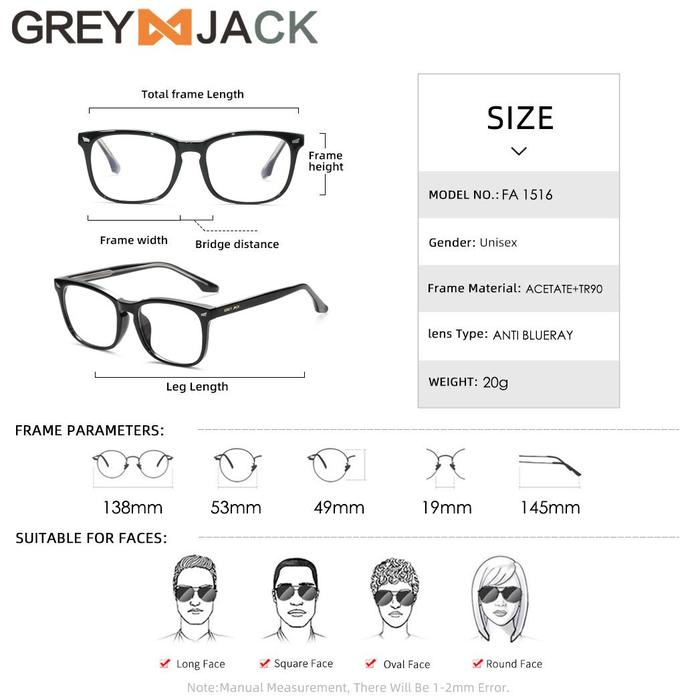 TERLARIS GREY JACK KACAMATA ANTIRADIASI BLUERAY KOTAK SIMPLE RINGAN ACETATE+TR90 TERBARU 1516 BLACK
