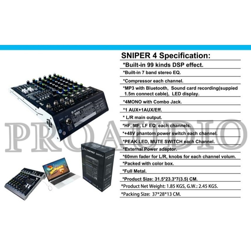 Mixer Audio Zetapro Sniper 4 4Channel Sniper-4 USB Bluetooth Soundcraft With Compressor