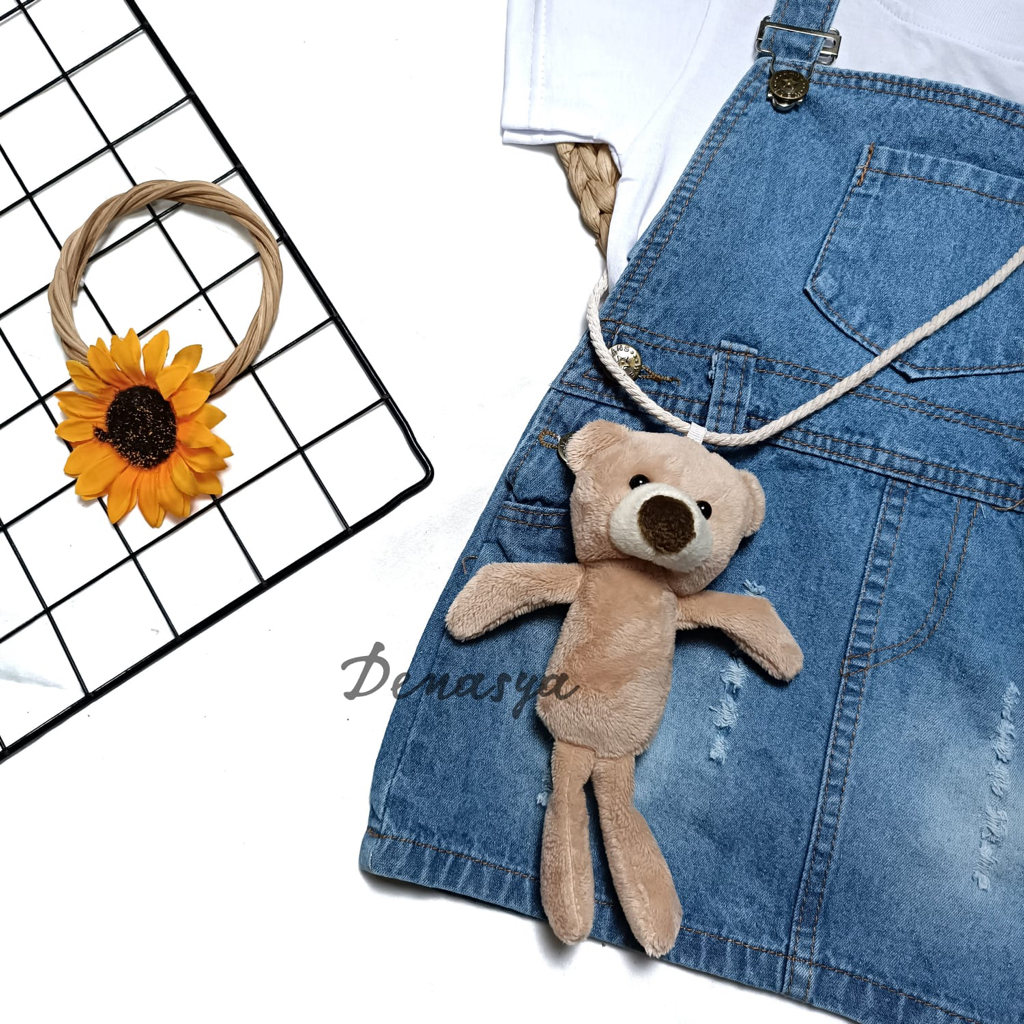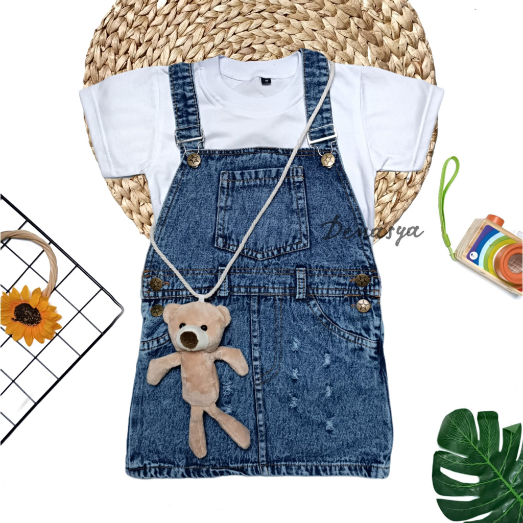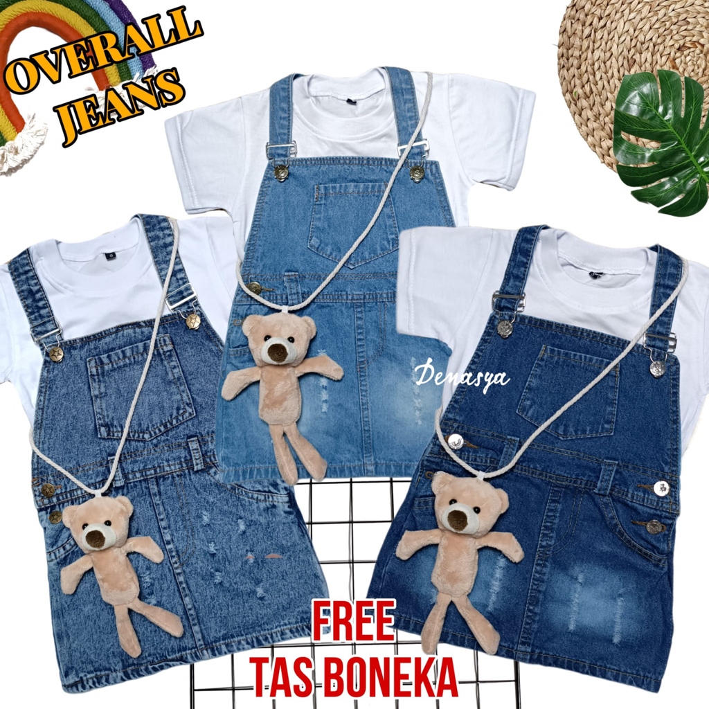 SETELAN OVERALL ANAK PEREMPUAN / OVERALL JEANS FREE TAS BONEKA KEKINIAN / JUMPSUIT ROK JEANS ANAK 6 bulan - 8 tahun