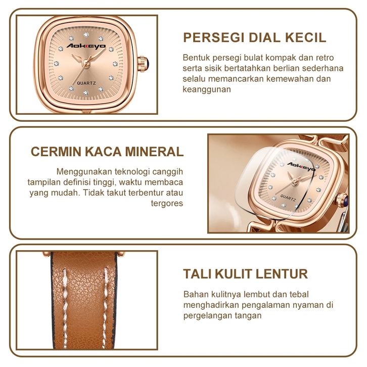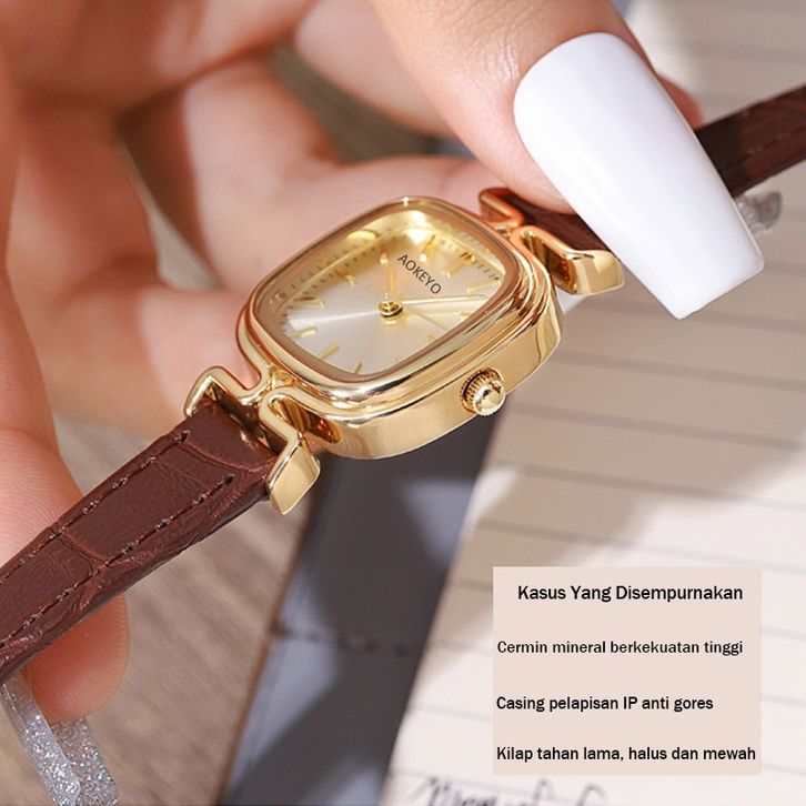 NewAOKEYO S065 Jam Tangan Wanita Retro Anggun Kuarsa Berlian Jam Tangan Kulit Original Anti Air