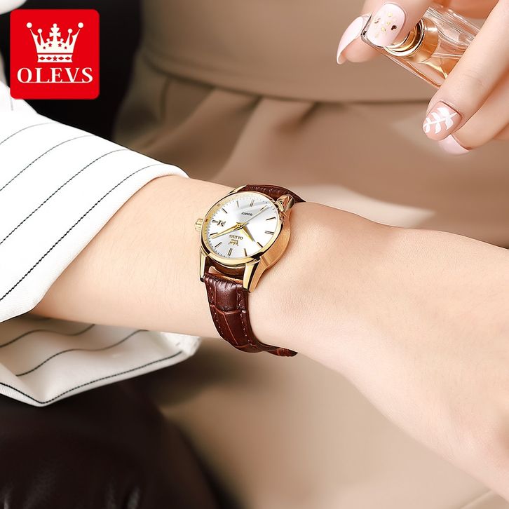 OLEVS Jam Tangan Wanita Anti Air Original Branded Kecil Tahan Air Tali Kulit Kuarsa Arloji Terbaru