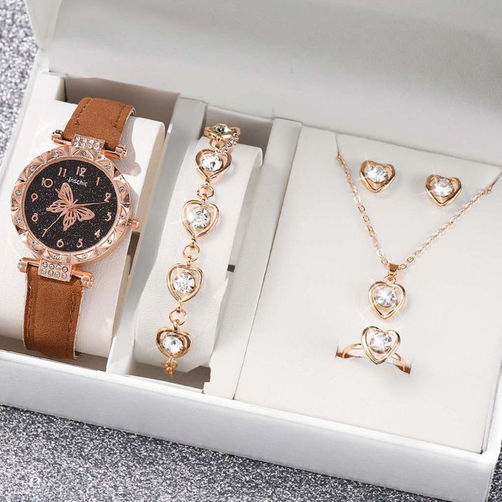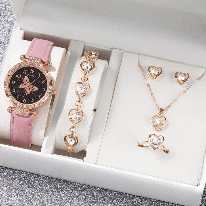6 Pcs Jam Tangan Kuarsa Kupu-Kupu Wanita Dengan Aksesoris Fashion Mutiara Jam Tangan Sabuk Wanita