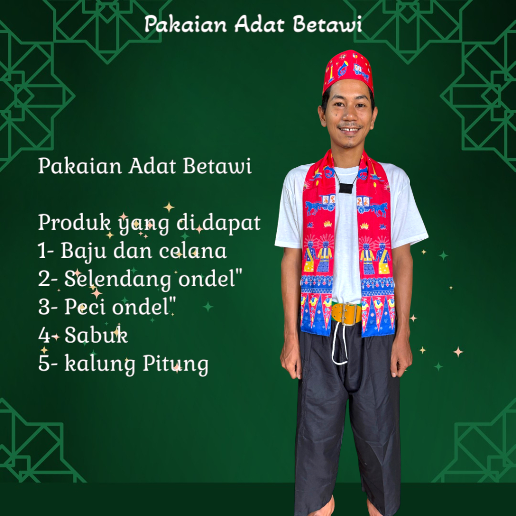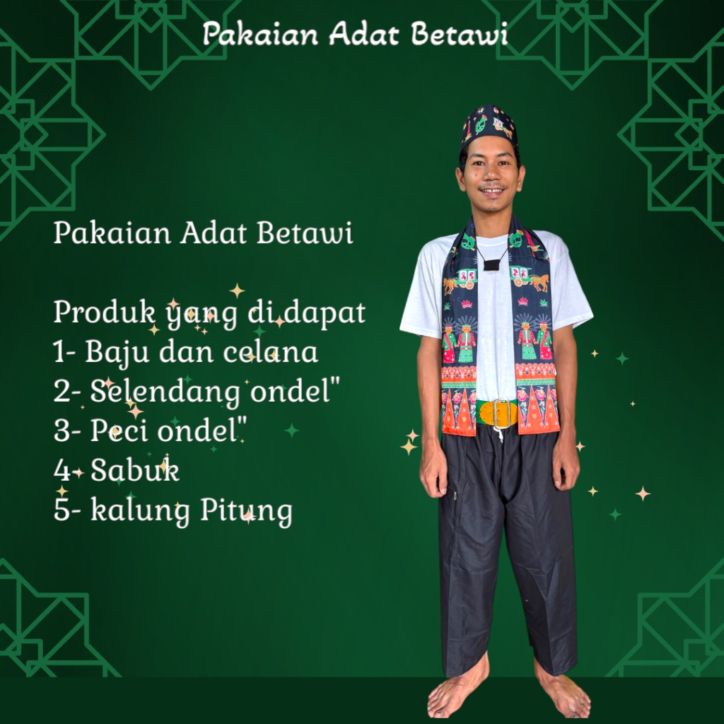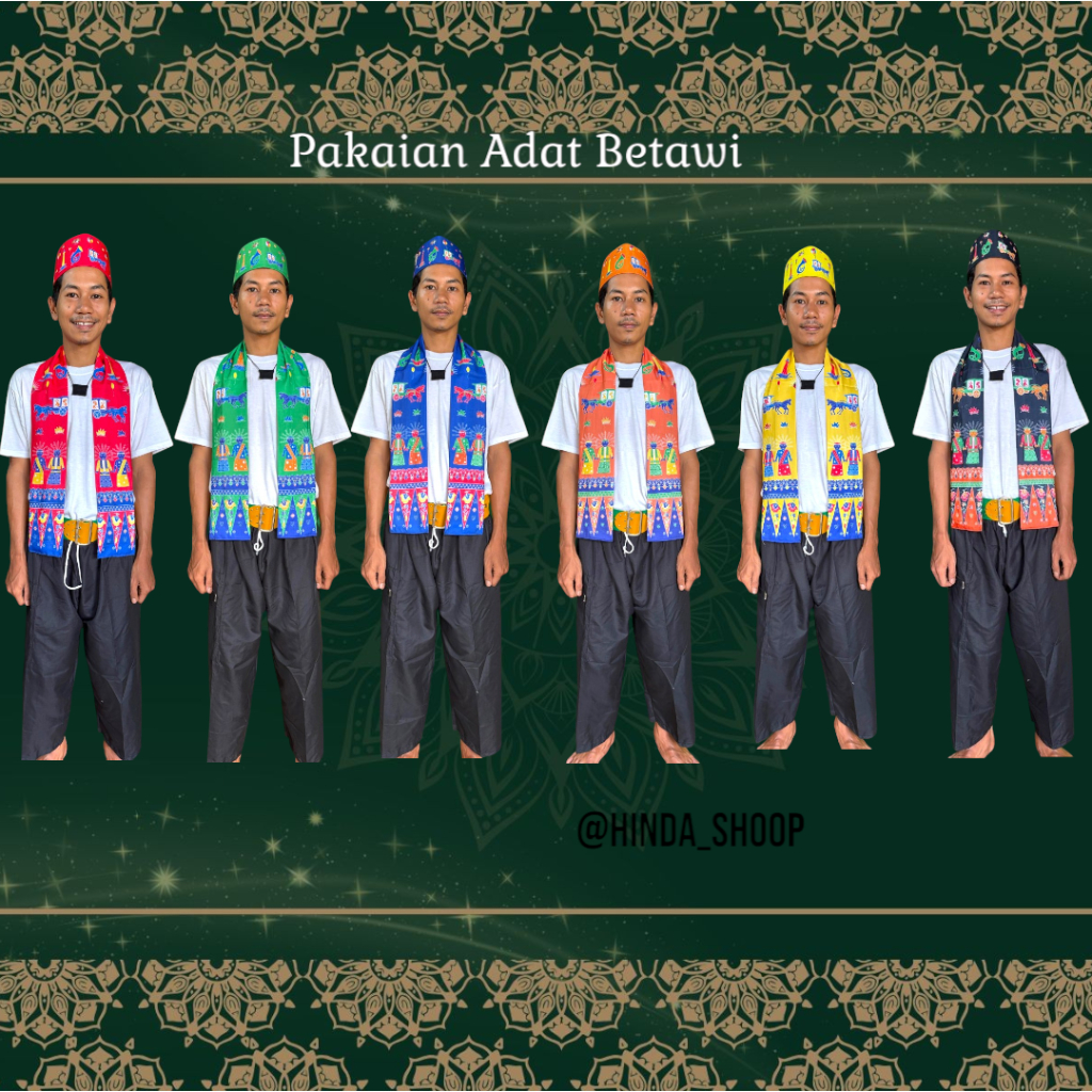 Setelan Baju Adat Betawi / Pakaian Adat Betawi / Baju Betawi /Selendang Ondel Ondel/Peci Ondel Ondel