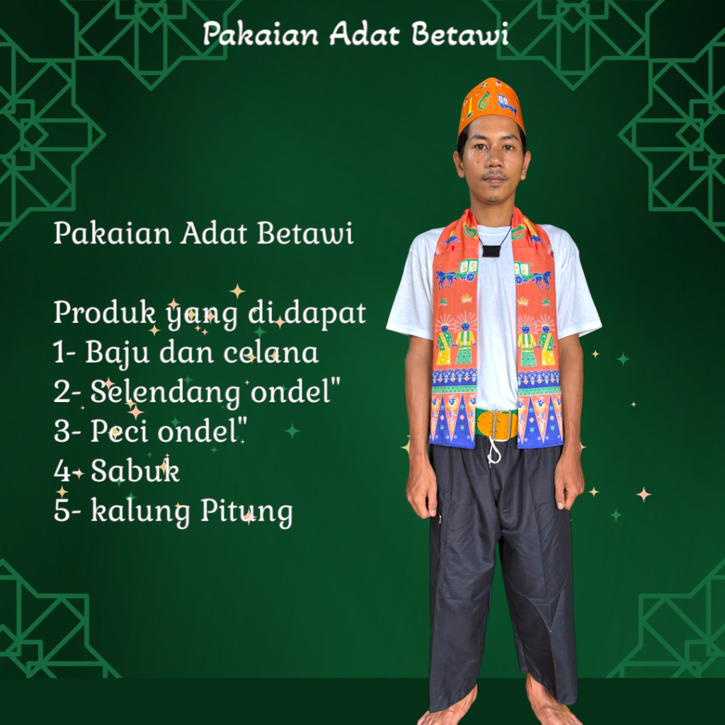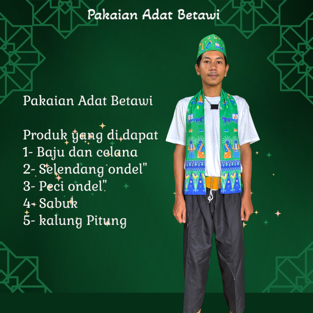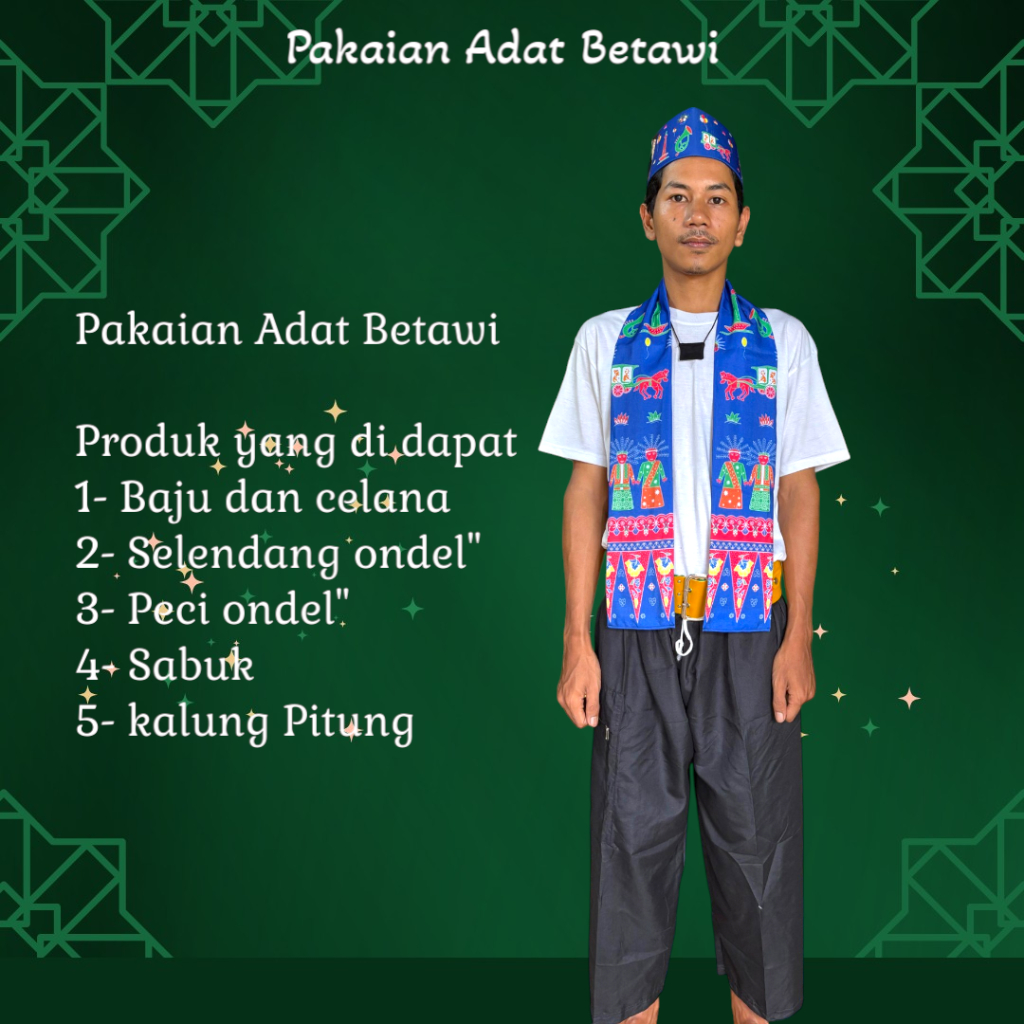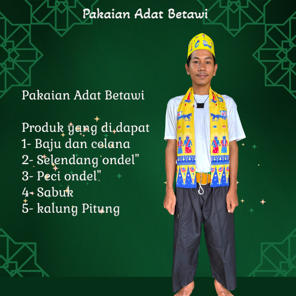 Setelan Baju Adat Betawi / Pakaian Adat Betawi / Baju Betawi /Selendang Ondel Ondel/Peci Ondel Ondel