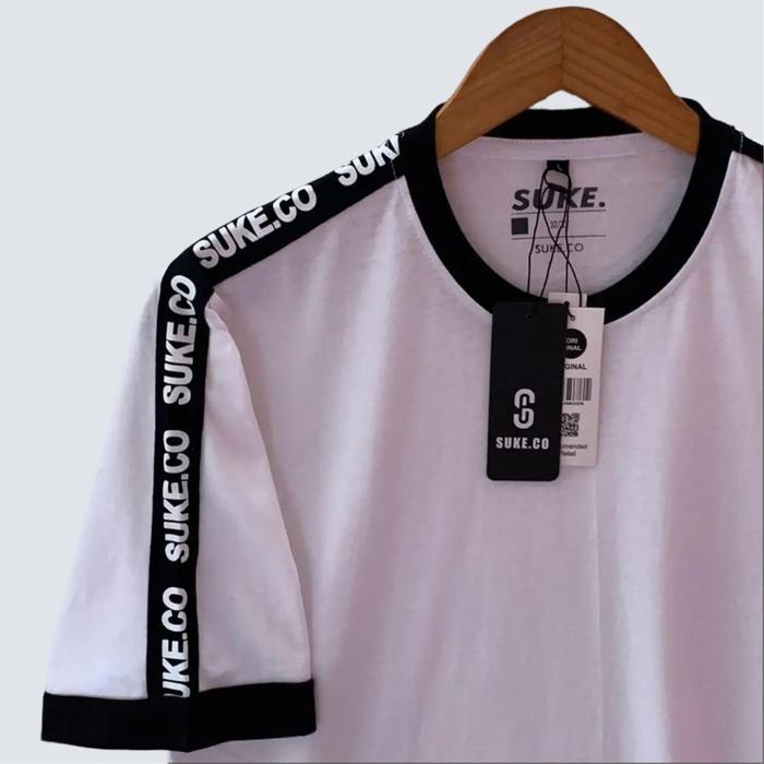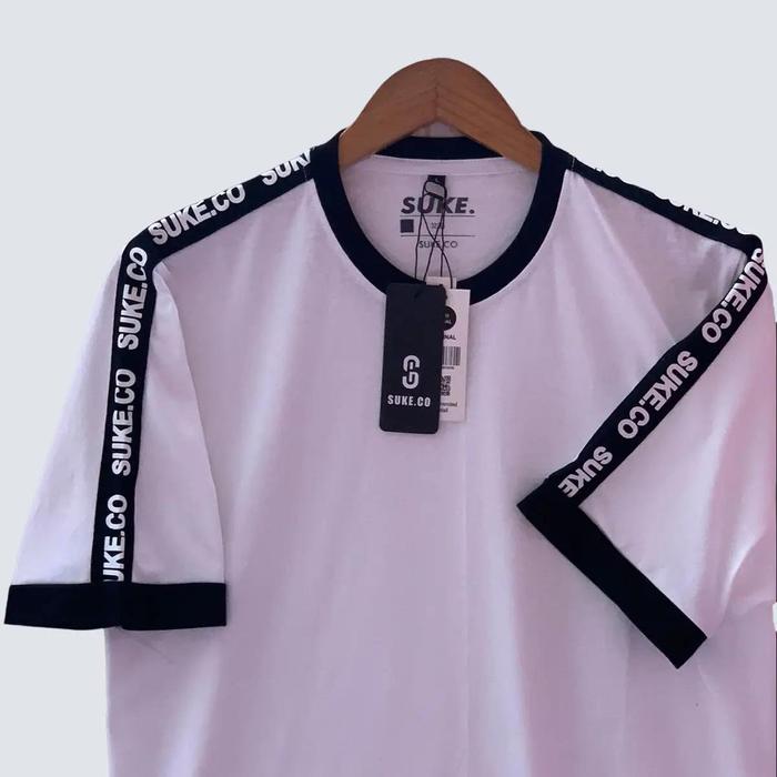 kaos lengan pendek cowok suke brand lokal tshirt taping bahu warna putih kaos putih SKXH