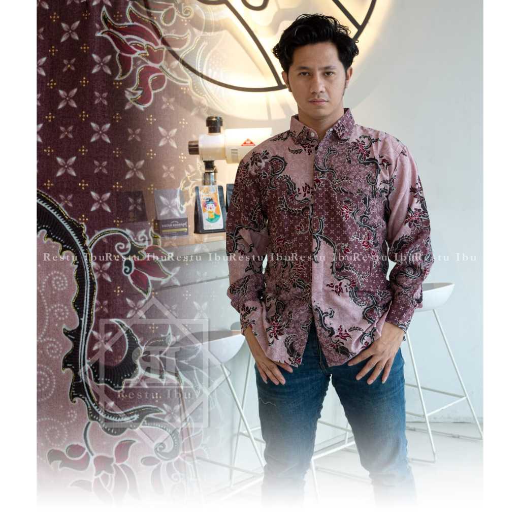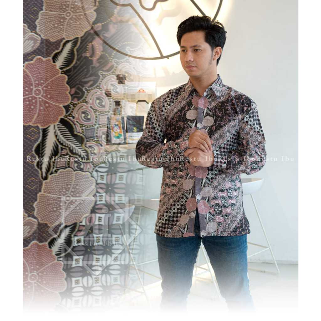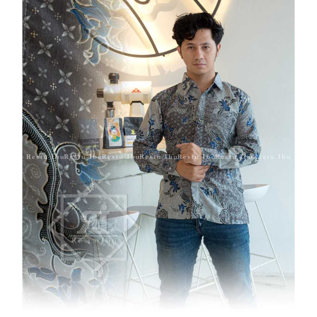 Kemeja batik panjang floral terbaru motif mega mendung abu