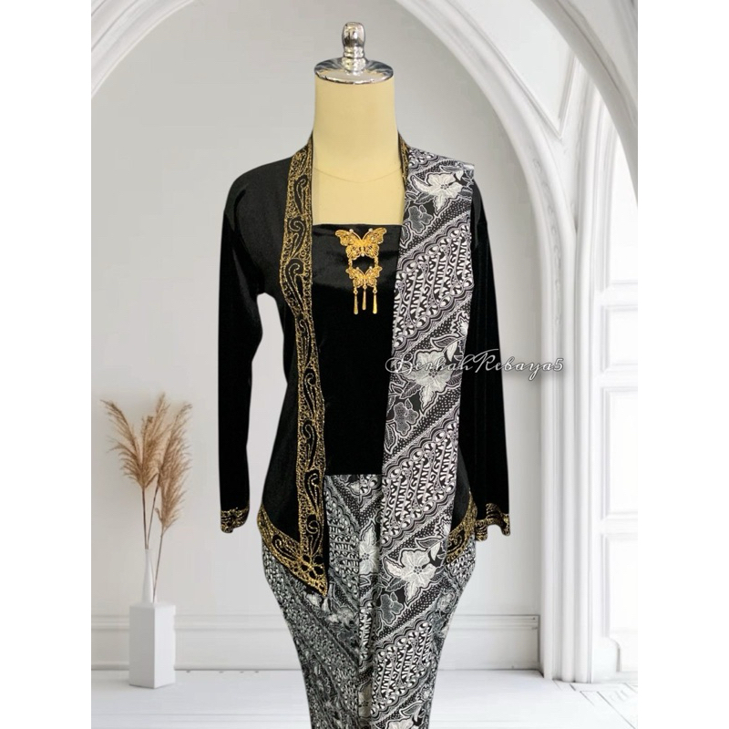 Setelan Kebaya Kutu Baru Bordir Warna Hitam / Kebaya + Selendang + Jarik Wiru