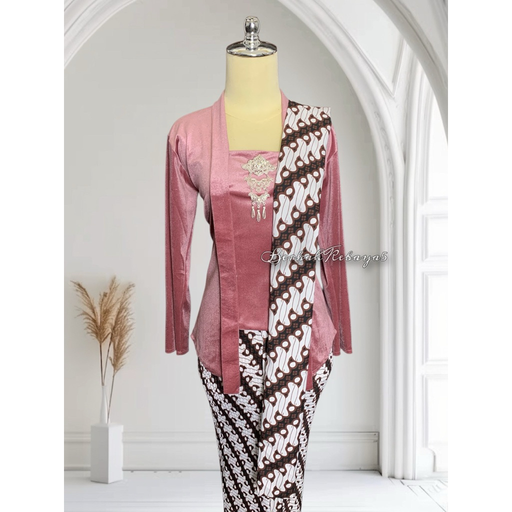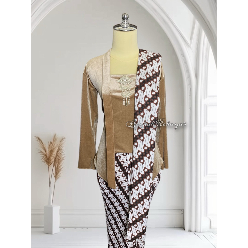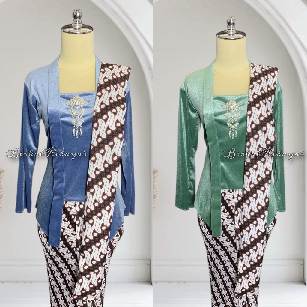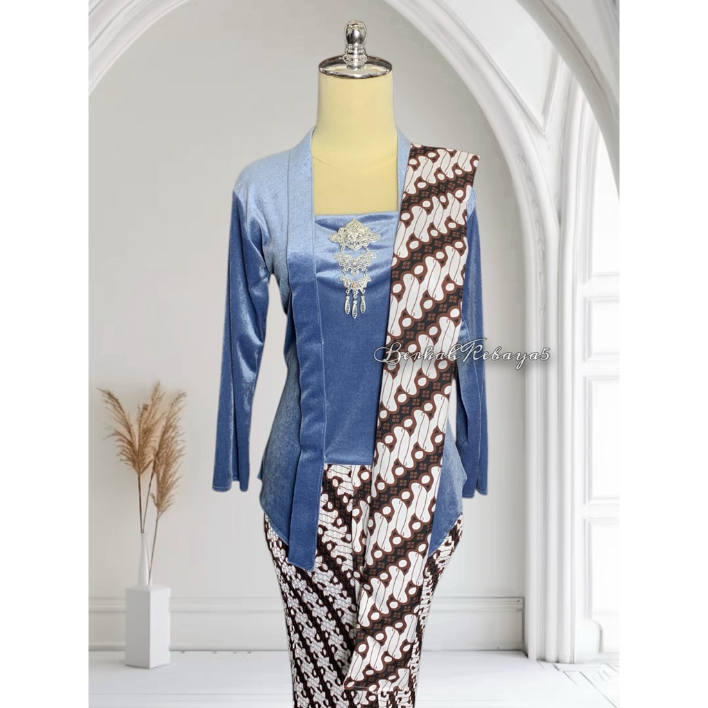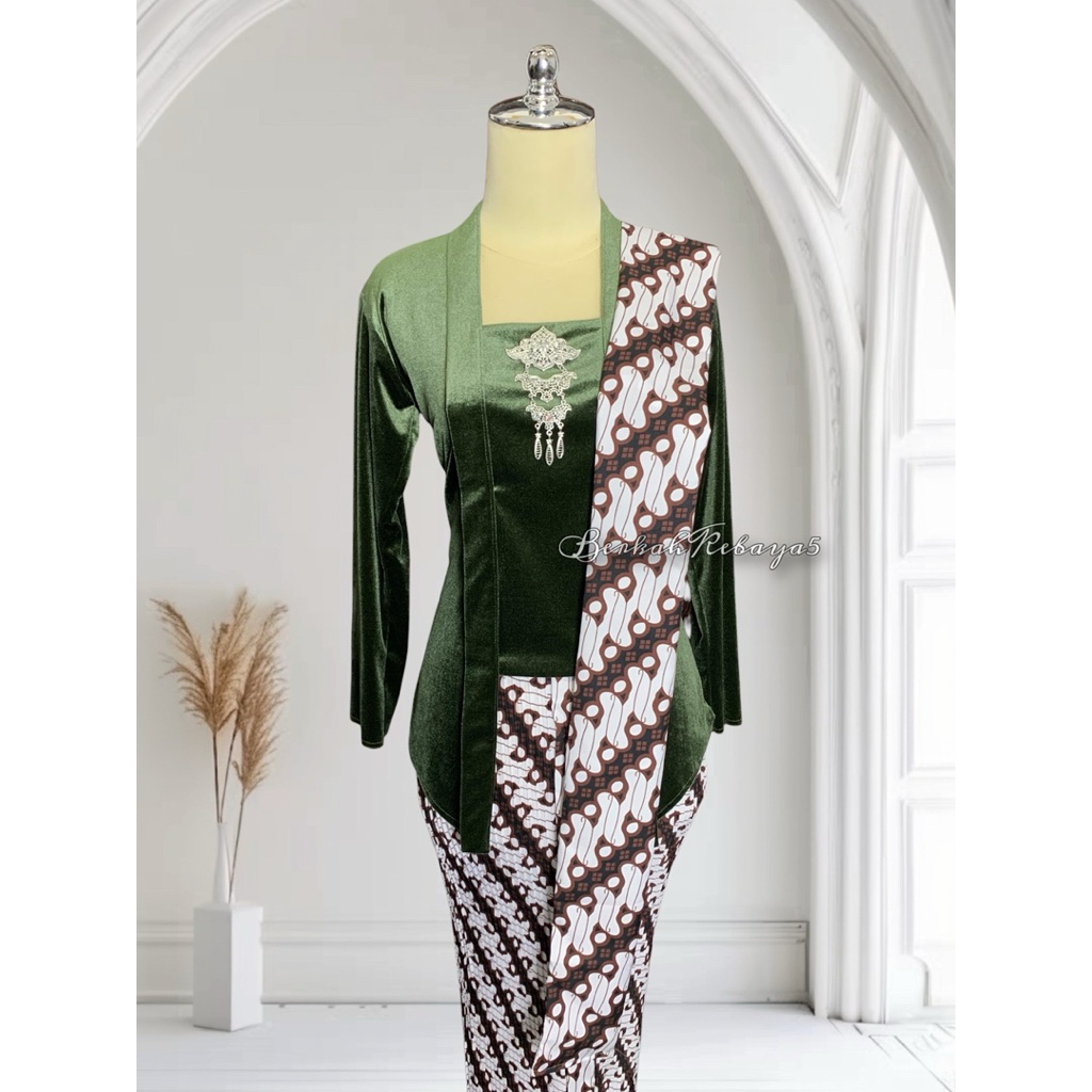 Setelan Kebaya Kutu Baru Bludru Warna Soft / Kebaya + Selendang + Jarik Wiru Plisket Motif Parang Lereng Barong