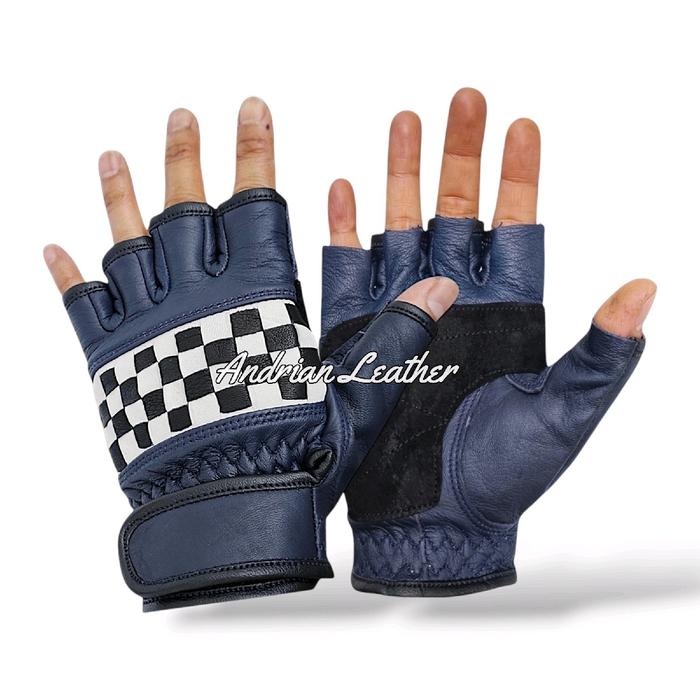 PROMO TERBATAS GLOVES MOTOR HALF FINGER KULIT ASLI SARUNG TANGAN KULIT ASLI CORAK CATUR UNISEX PRIA WANITA ANTI SINAR UV BIRU M