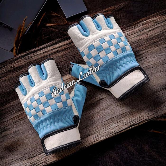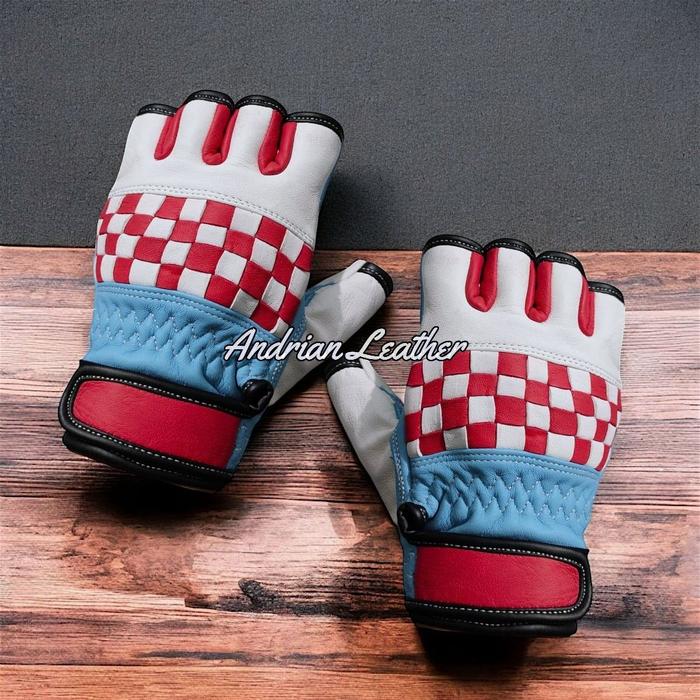 PROMO TERBATAS SARUNG TANGAN MOTOR KULIT ASLI KLASIK CORAK CATUR PENDEK RETRO KLASIK SETENGAH JARI UNISEKS PRIA WANITA MERAH M