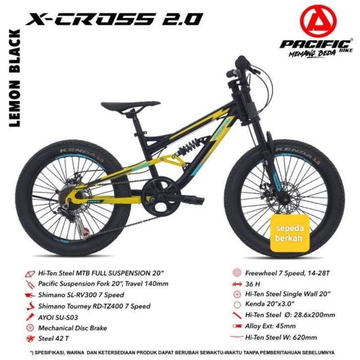 Terbaru sepeda gunung sepeda MTB 20 pacific x cross 2.0 ban jumbo 3.0 gigi suspensi penuh rem cakram